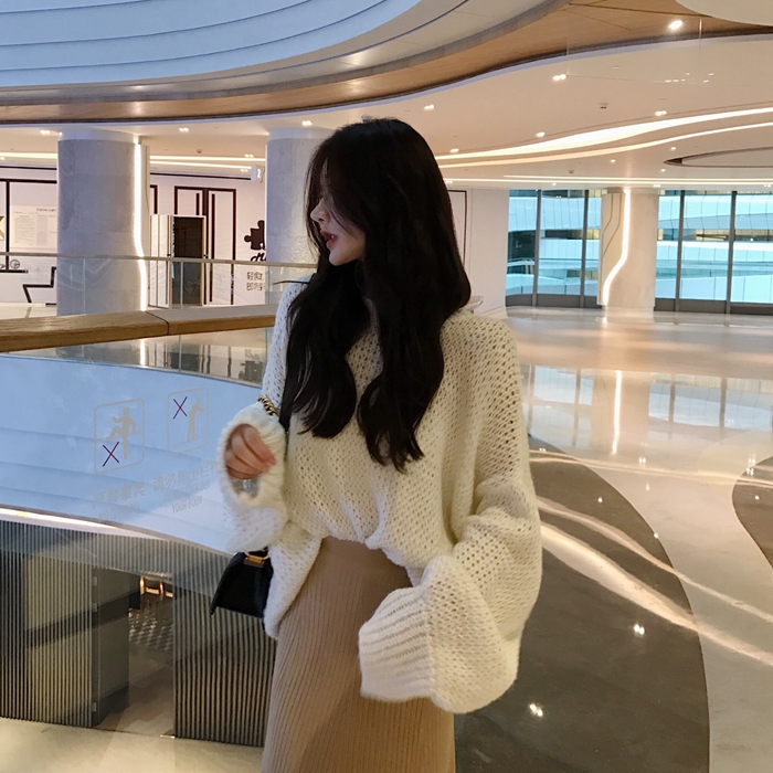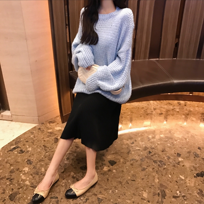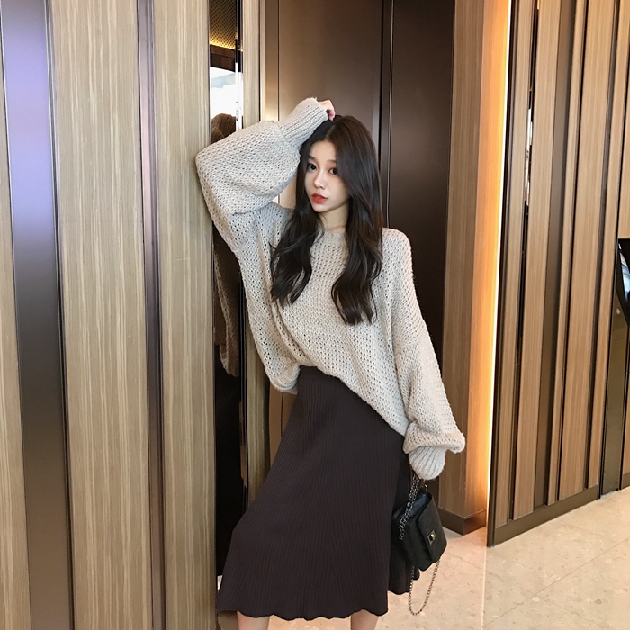 2018新款chic慵懶風寬松套頭毛衣高腰包臀針織毛線半身長裙套裝女