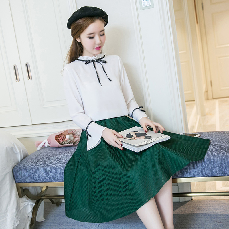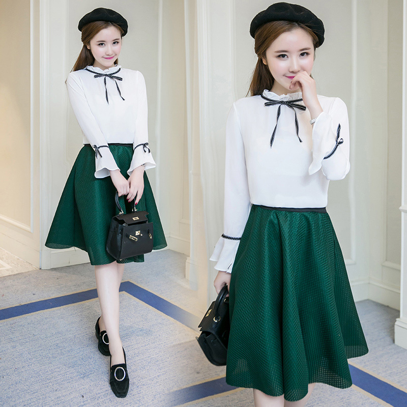 / 春季新款時尚套裝裙女喇叭袖襯衫+中長款大擺A字裙氣質兩件套