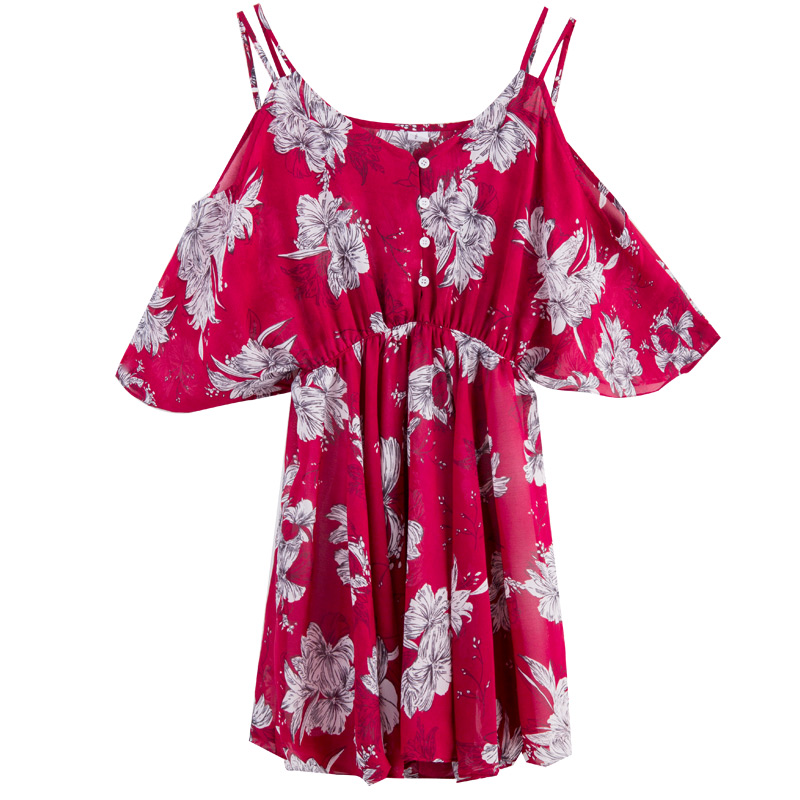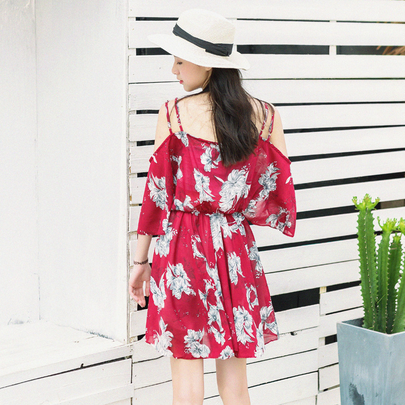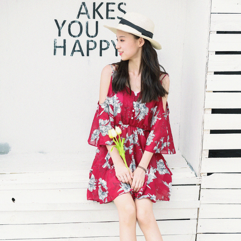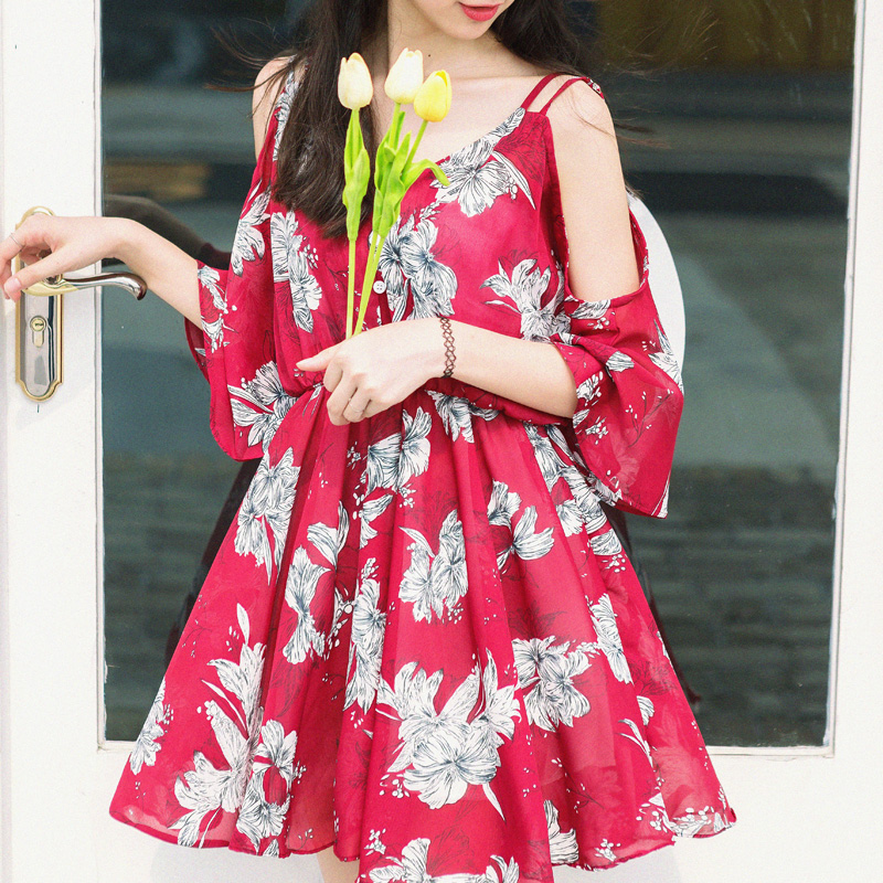 / 夏裝新款韓版女裝復古花色連衣裙喇叭袖漏肩雪紡印花度假裙子
