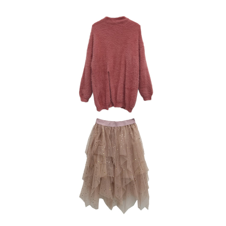 / 秋裝女2018新款小心機開叉長袖貂絨毛衣+閃閃星月亮片半身裙套裝