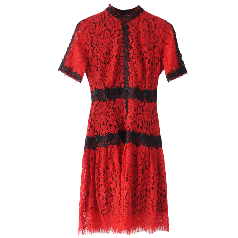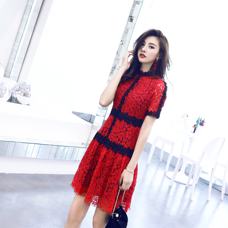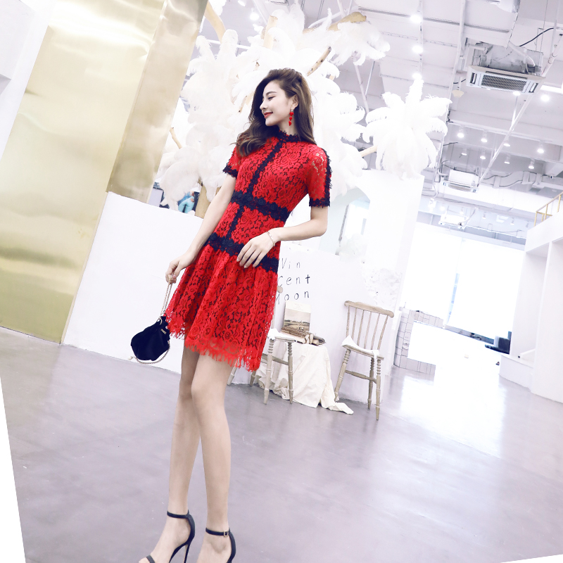 / 溫柔風2018夏裝新款半高領短袖仙氣蕾絲修身連衣裙中長款歐洲站潮