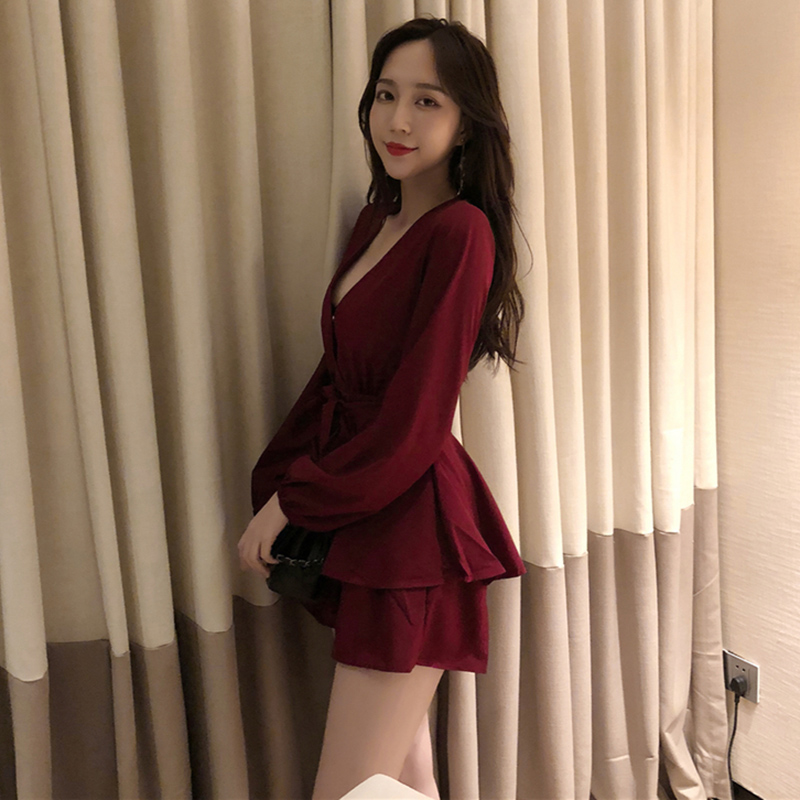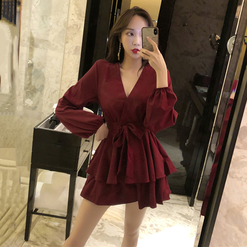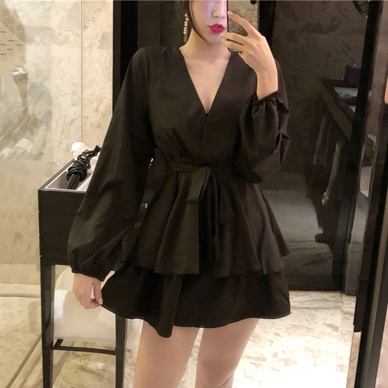 / 復古小黑裙女秋裝新款仙氣質寬松顯瘦V領長袖綁帶連衣裙A字短褲裙