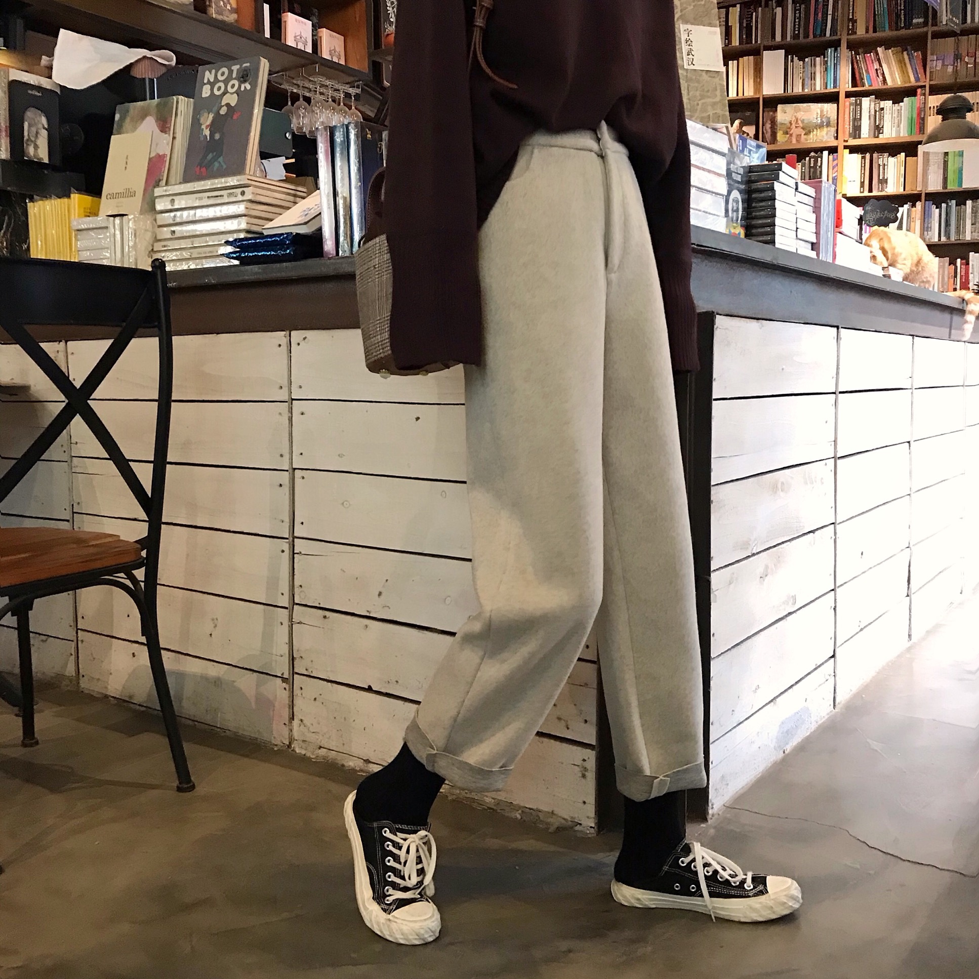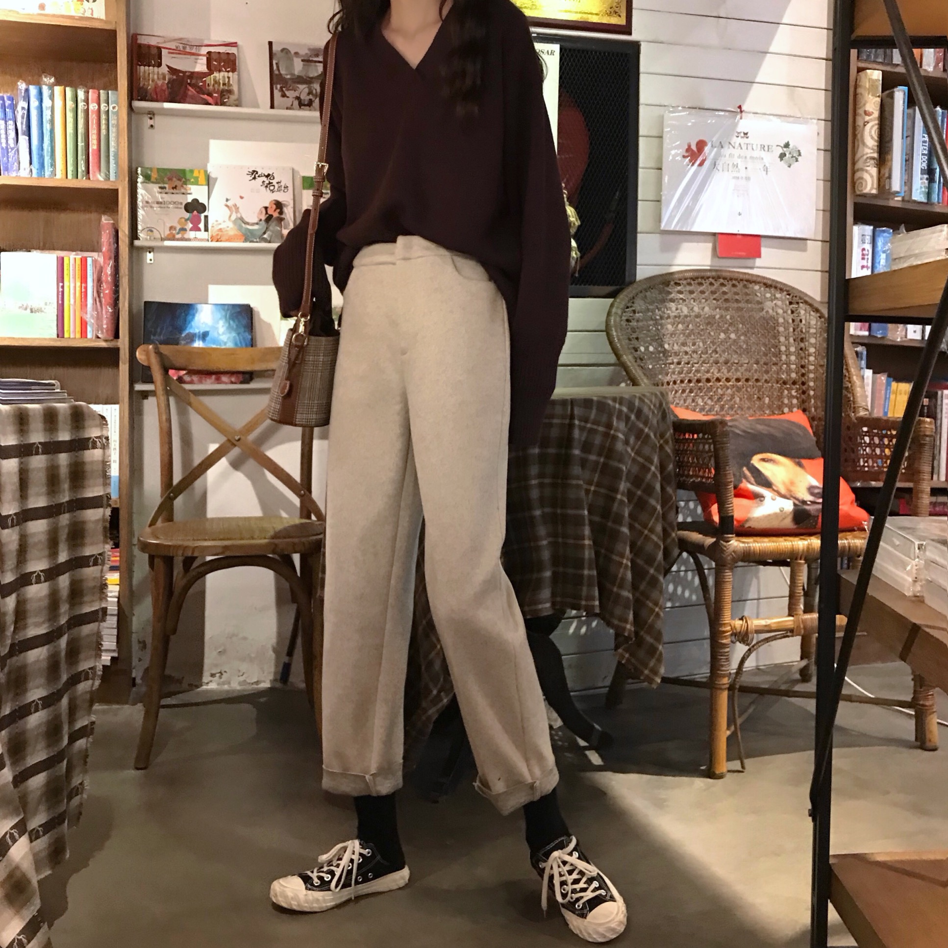 / 韓版復古褲子女秋2018新款時尚百搭休閑寬松高腰呢子直筒褲長褲女