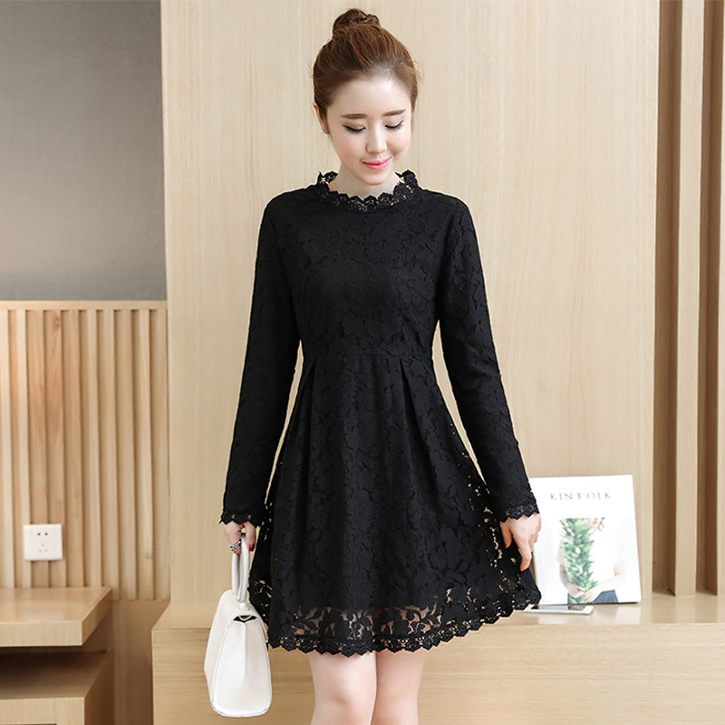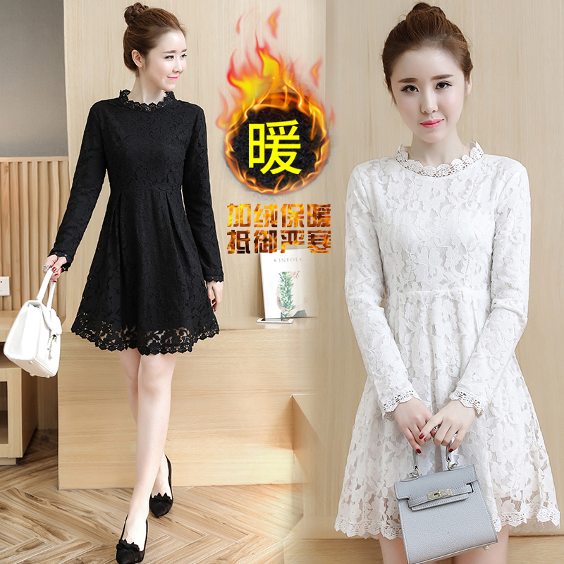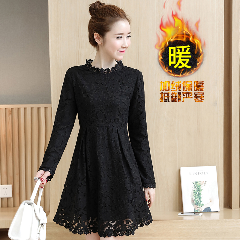 / 秋冬新款修身鏤空蕾絲連衣裙長袖加絨加厚大碼顯瘦A型打底裙