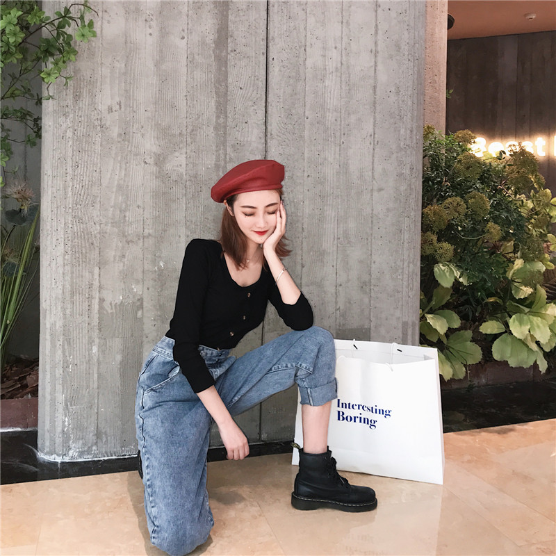 / 秋季韓版高腰兩粒扣牛仔褲復古水洗做舊寬松闊腿褲直筒褲九分褲女