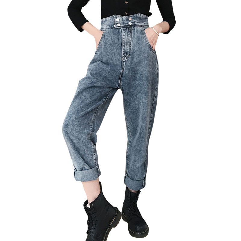 秋季韓版高腰兩粒扣牛仔褲復古水洗做舊寬松闊腿褲直筒褲九分褲女