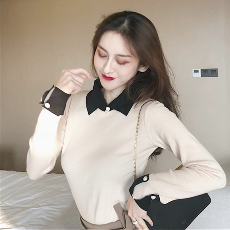 冷系修身針織衫秋裝女2018新款韓版時尚翻領拼色打底毛衣洋氣上衣