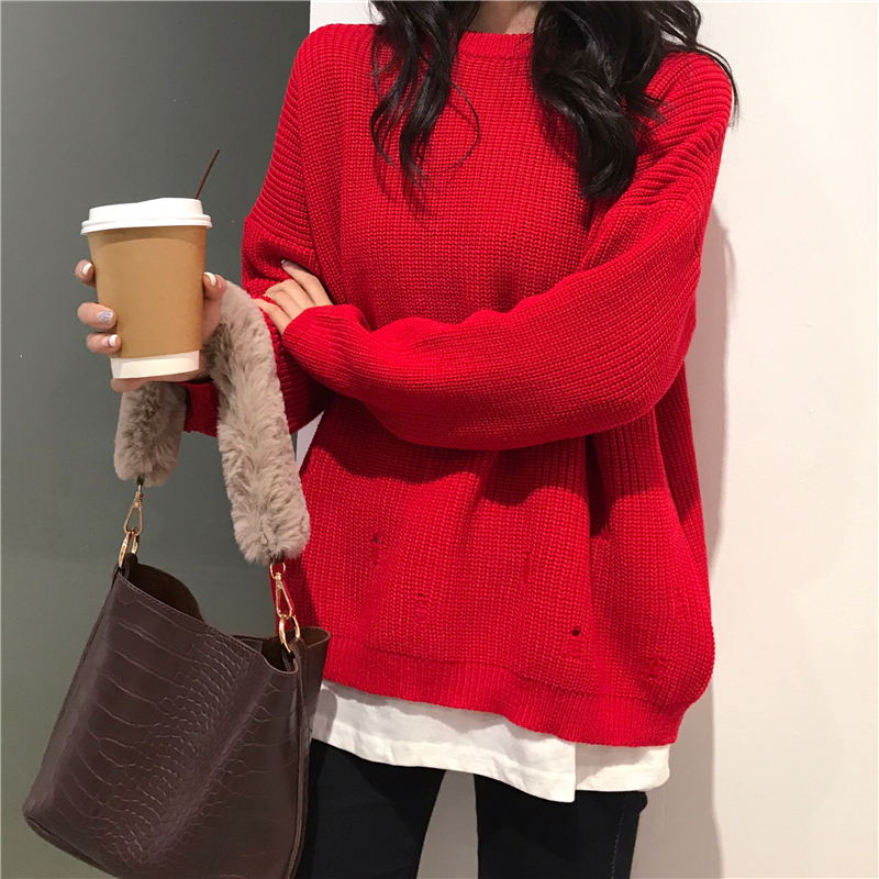 港味網紅同款打底毛衣外套女秋冬2018新款韓版寬松套頭長袖針織衫