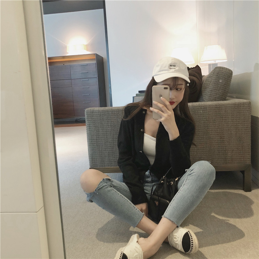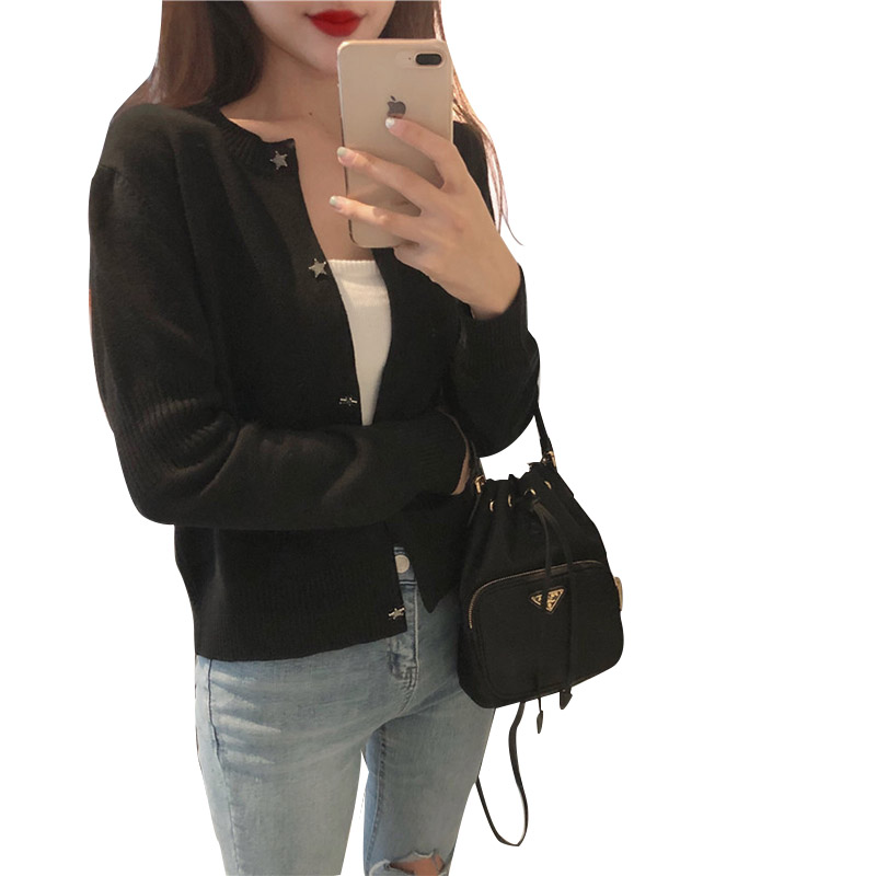 秋裝女2018新款氣質黑色針織開衫外套女短款韓版寬松顯瘦圓領毛衣