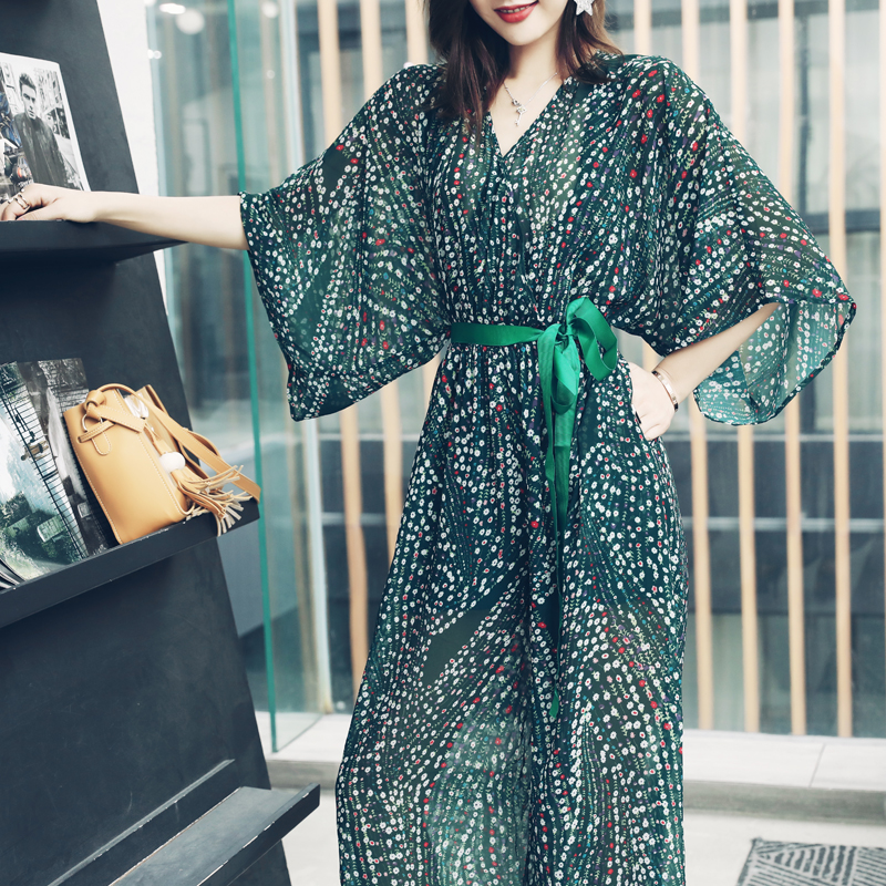 氣質時尚印花連體褲2018夏季新款V領高腰系帶顯瘦顯高闊腿長褲女