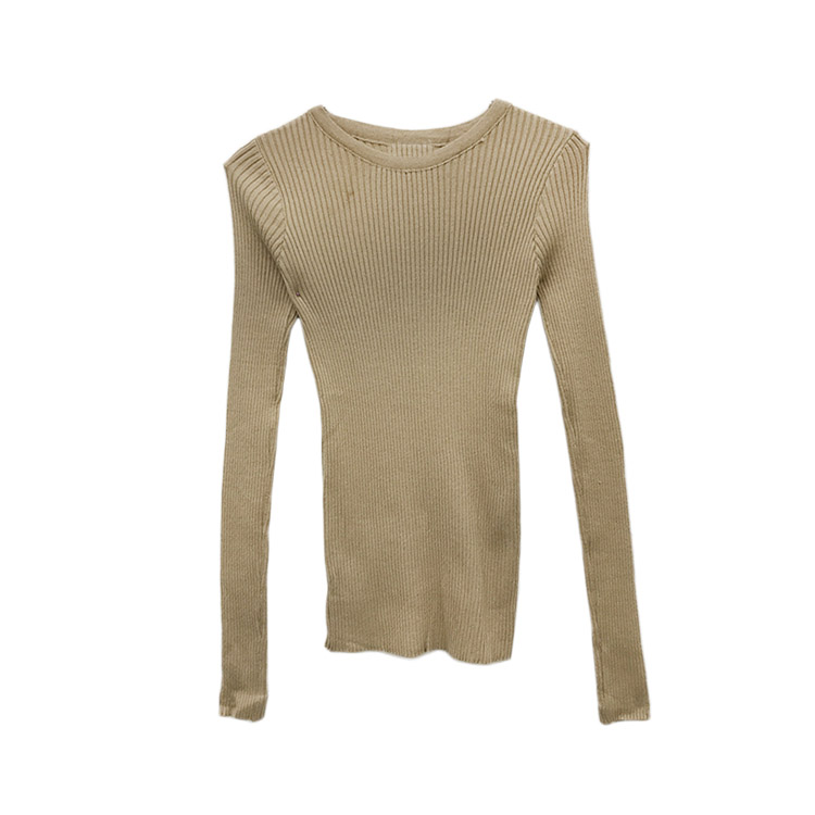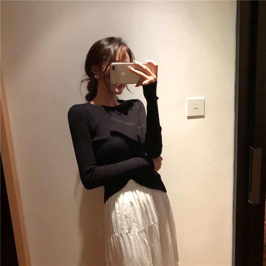 chic早秋針織衫簡約圓領修身長袖針織衫上衣女秋季純色基礎打底衫