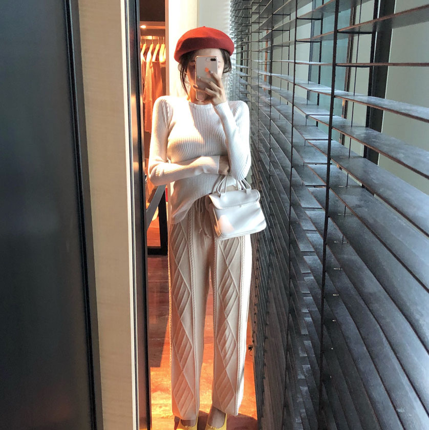 / 復古港味秋裝女2018新款百搭純色針織衫坑條修身長袖圓領打底上衣