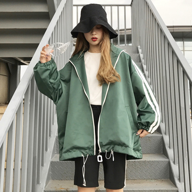 春季新款女裝寬松復古高領運動休閑外套女學生兩條杠長袖風衣開衫