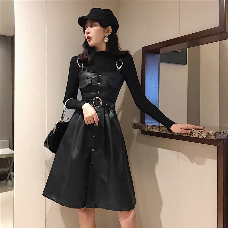 女神套裝秋冬新款半高領修身打底衫+單排扣PU皮背帶裙時尚兩件套