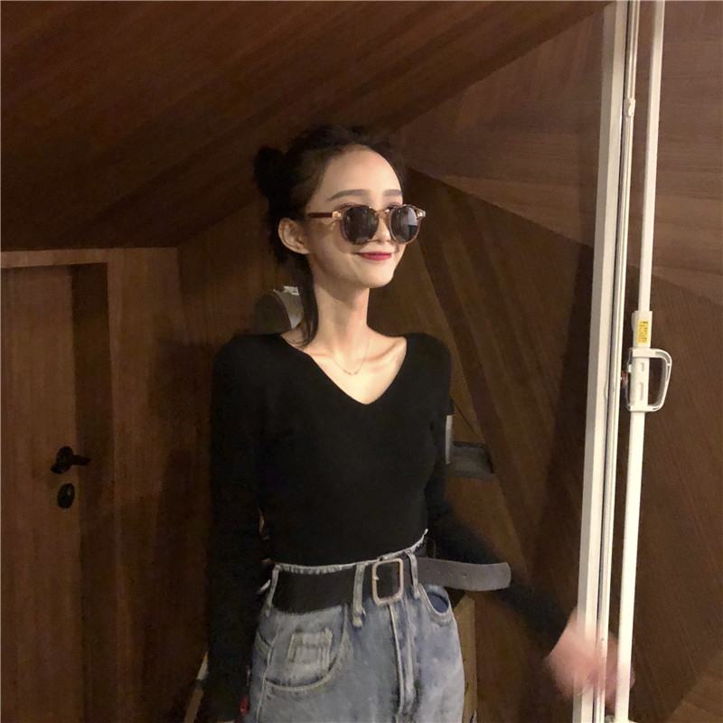 時尚韓風秋天上衣女新款純色V領長袖顯瘦簡約基礎百搭打底衫T恤潮