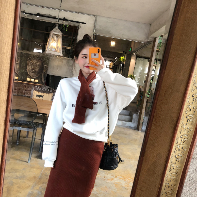 韓版加絨寬松人像圖案圍脖衛衣高腰純色包臀裙時尚套裝chic兩件套