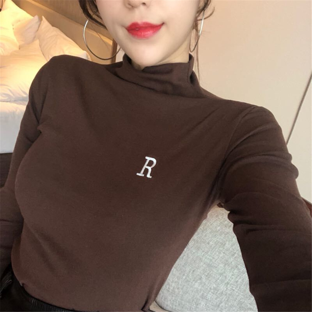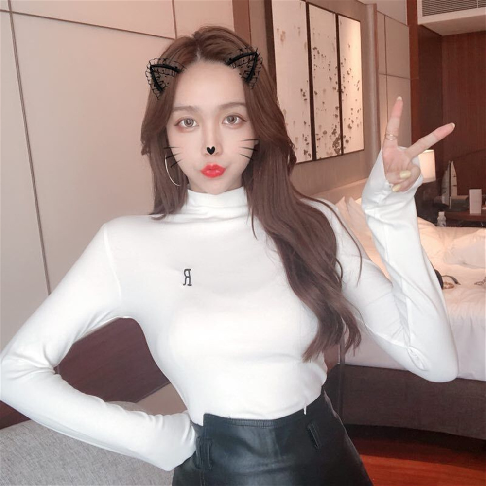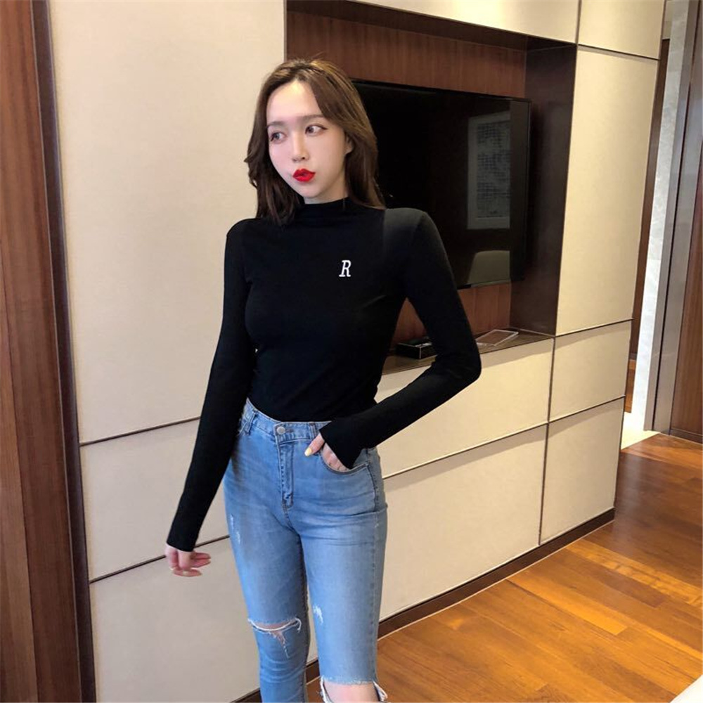 chic早秋上衣女2018新款韓版T恤修身顯瘦百搭半高領刺繡打底衫潮