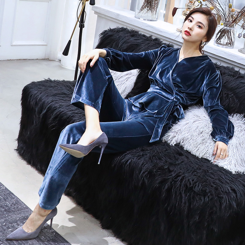 / 大氣絲絨套裝女時尚外套2018新款秋季洋氣休閑長褲金絲絨兩件套潮