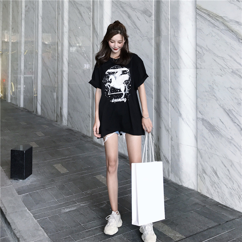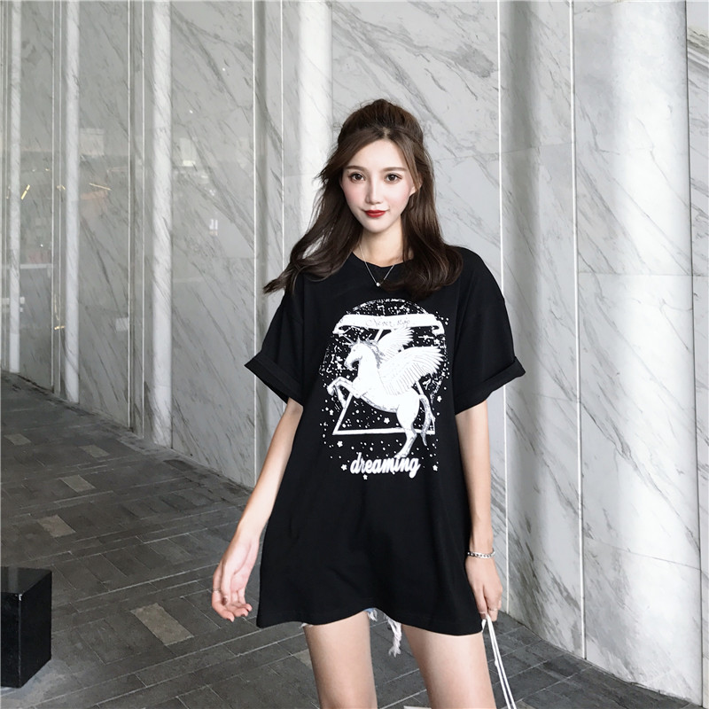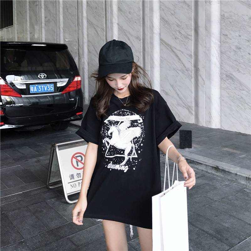 / 女裝夏裝2018新款女浪漫星點修身顯瘦獨角獸短袖中長款T恤上衣潮