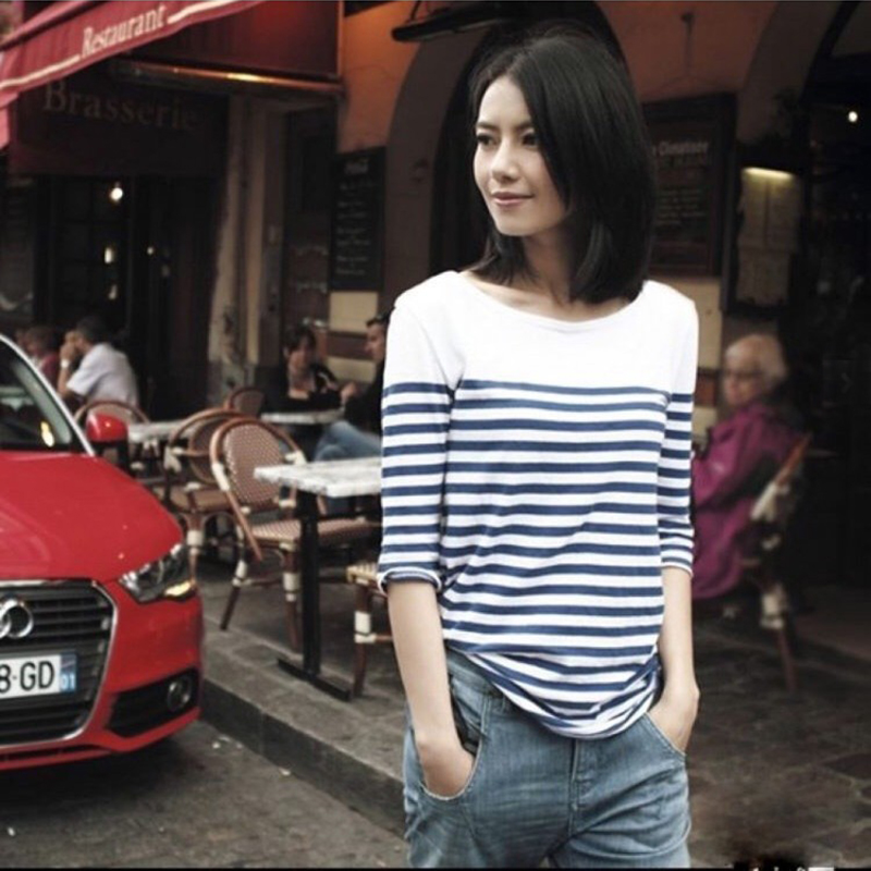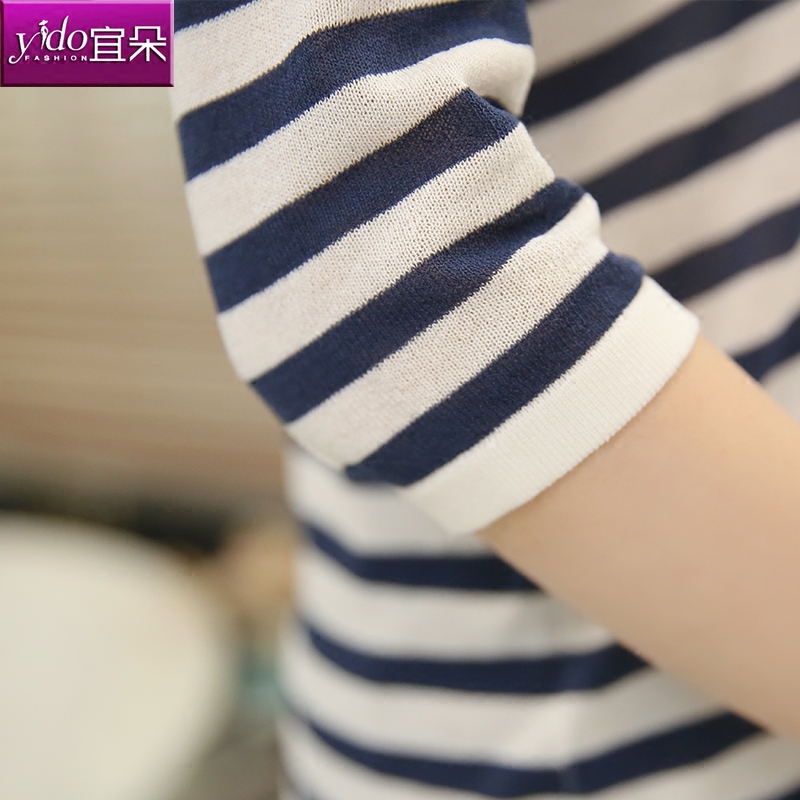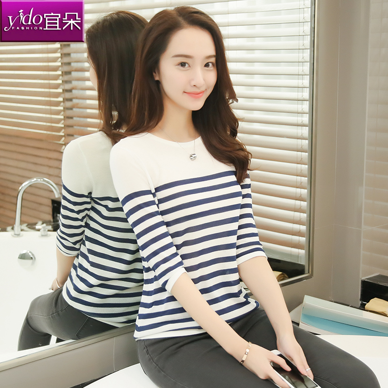 / 中袖條紋針織衫女短款春夏套頭打底衫外搭上衣針織衫T恤女薄
