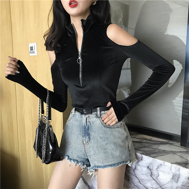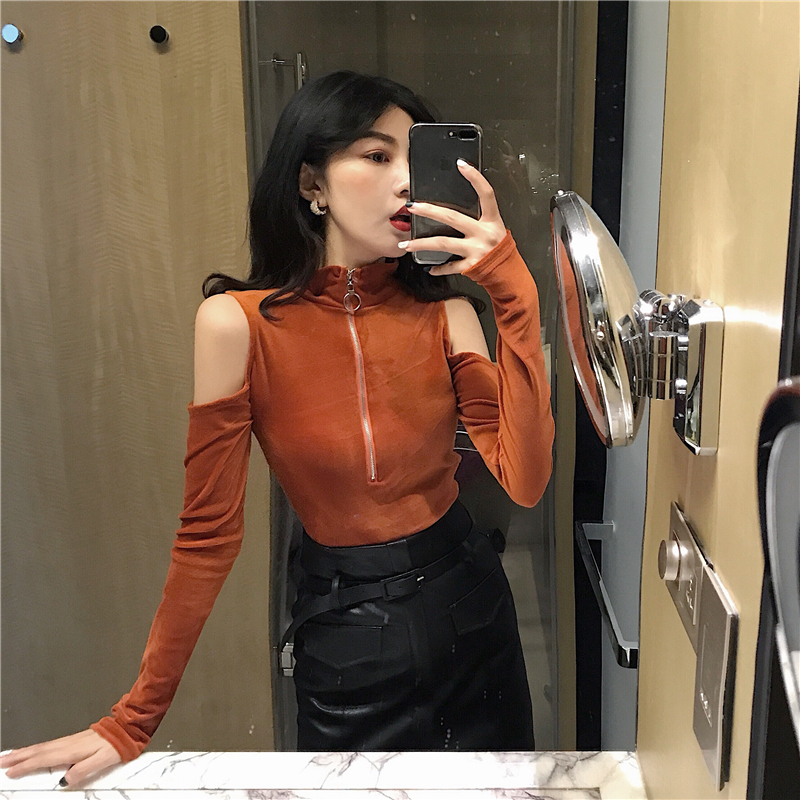港味秋冬新款韓版時尚chic修身性感上衣領口拉鏈小高領露肩打底衫