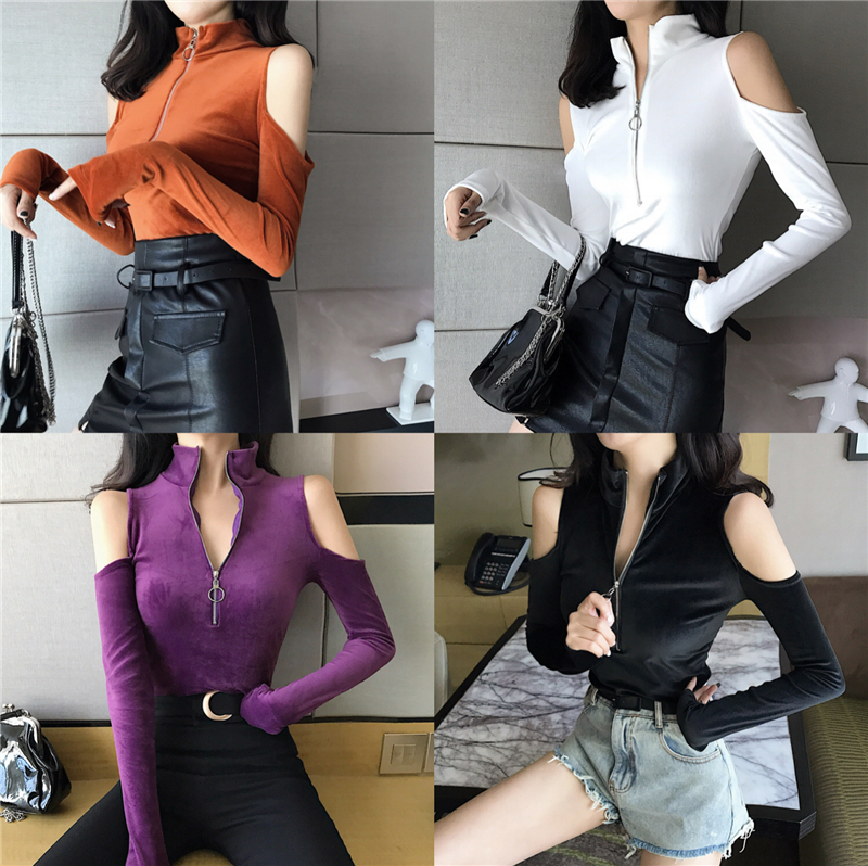 / 港味秋冬新款韓版時尚chic修身性感上衣領口拉鏈小高領露肩打底衫