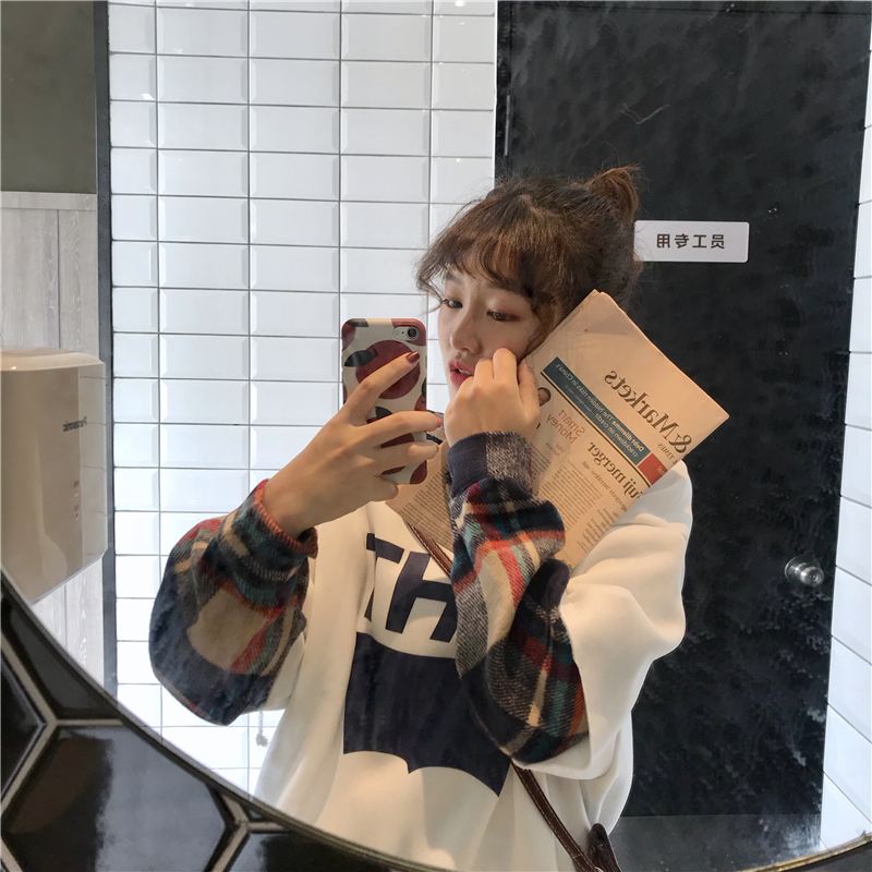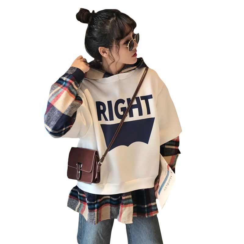 秋冬女裝韓版中長款原宿風寬松字母格子拼接連帽超火衛衣上衣外套