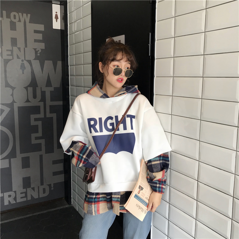 / 秋冬女裝韓版中長款原宿風寬松字母格子拼接連帽超火衛衣上衣外套