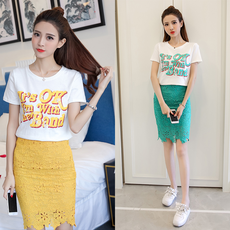 / 夏季小清新套裝女時尚潮寬松短袖T恤蕾絲半身裙兩件套連衣裙