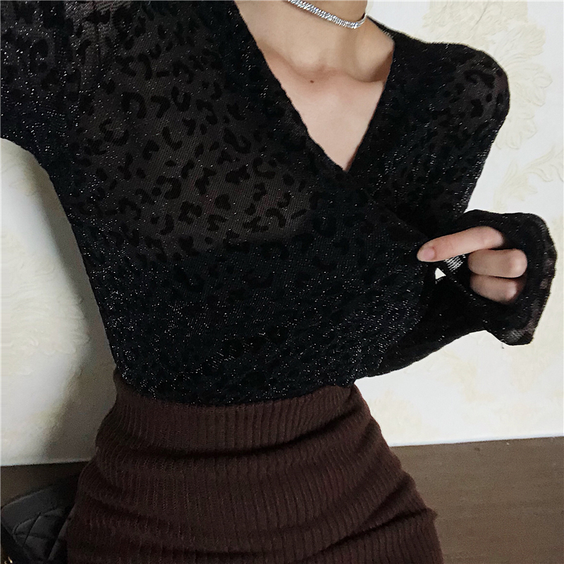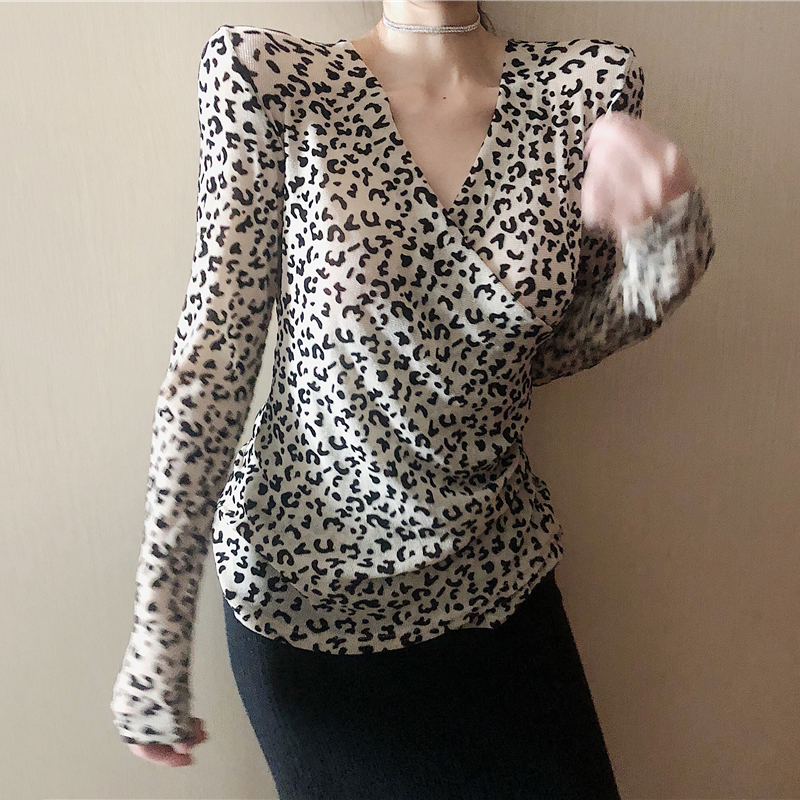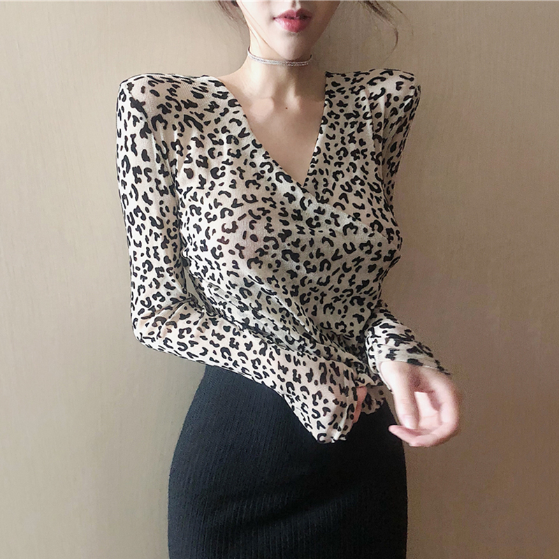 / 時尚復古豹紋V領漏鎖骨T恤上衣女秋裝新款修身透視長袖打底衫上衣