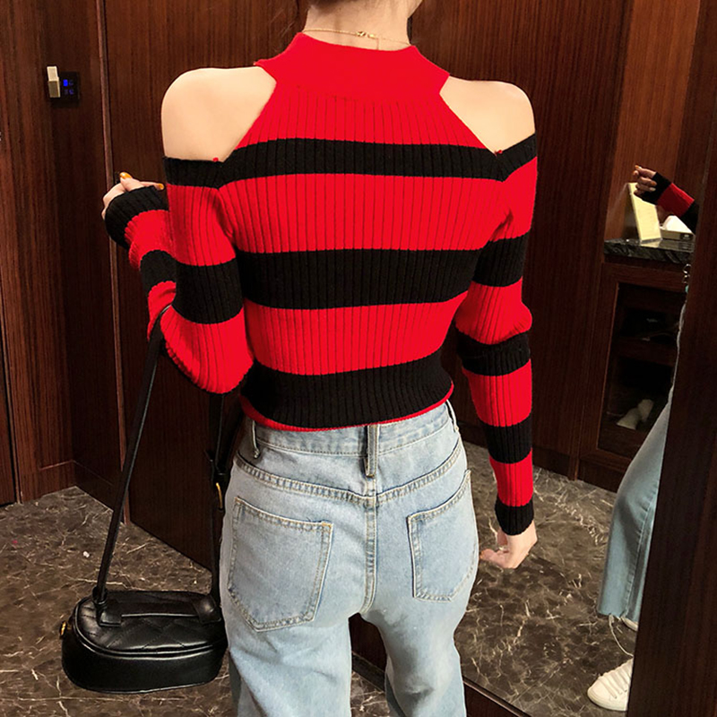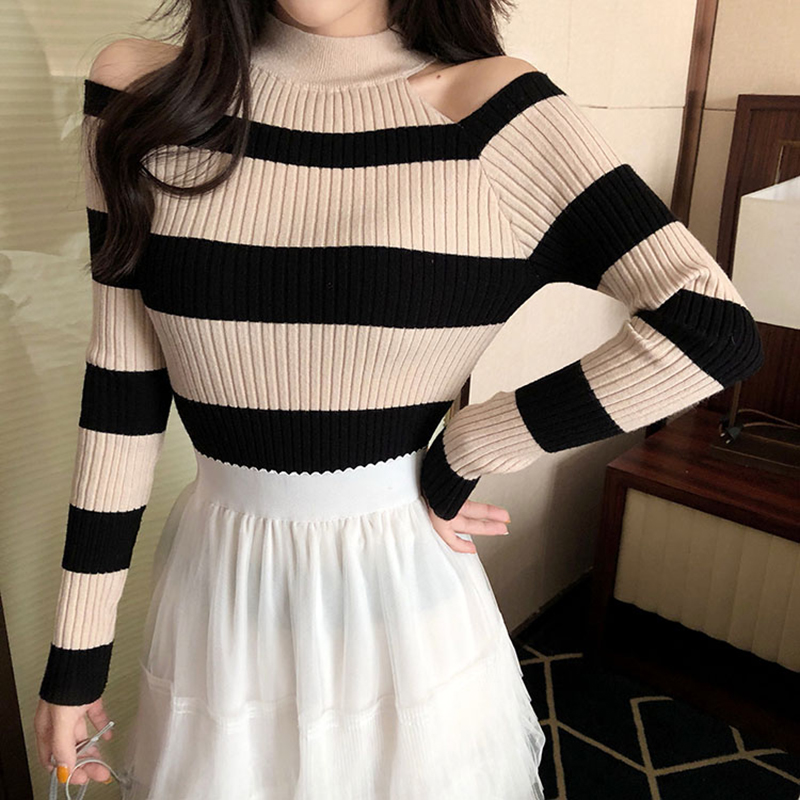 chic長袖打底針織衫女秋冬裝2018新款韓版撞色條紋心機露肩薄毛衣
