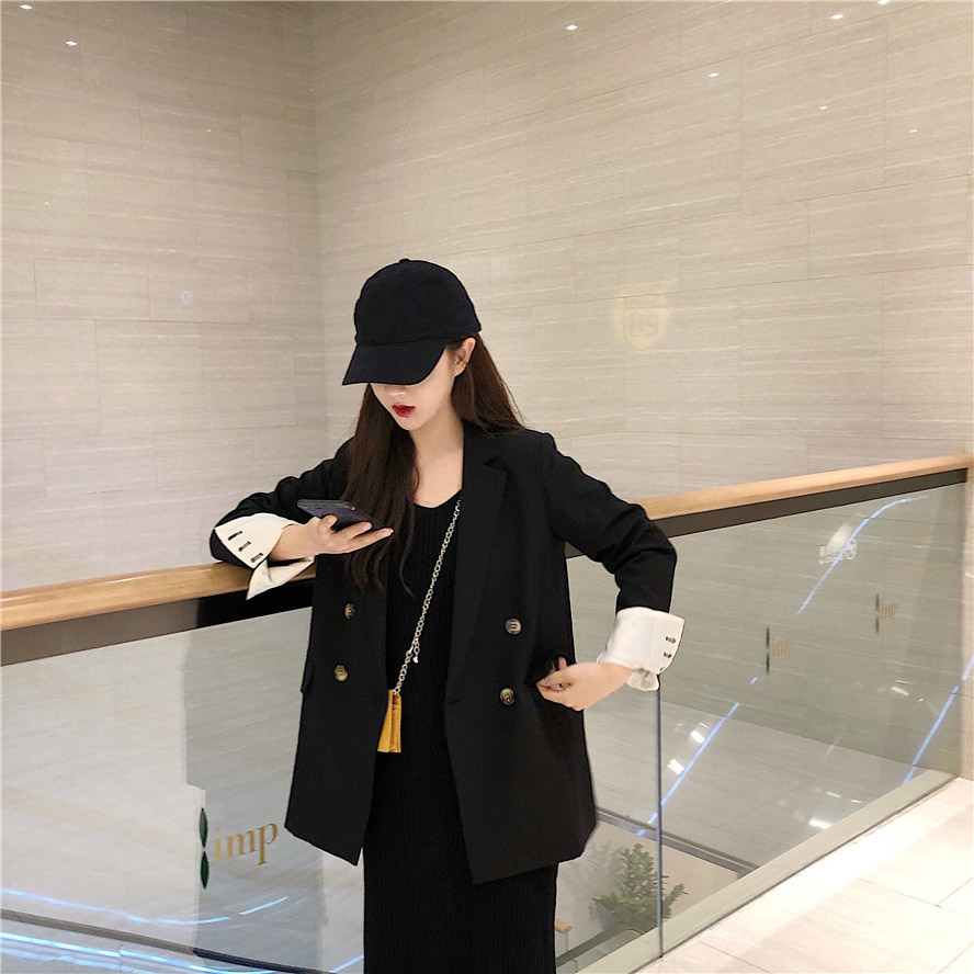/ 西裝套裝女chic外套寬松港風復古小西服V領針織吊帶連衣裙兩件套