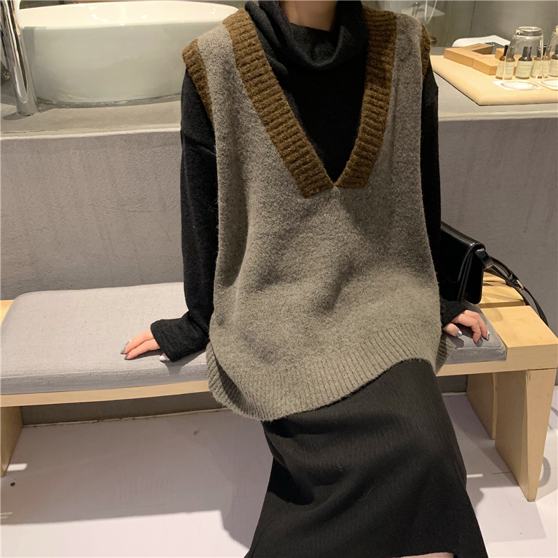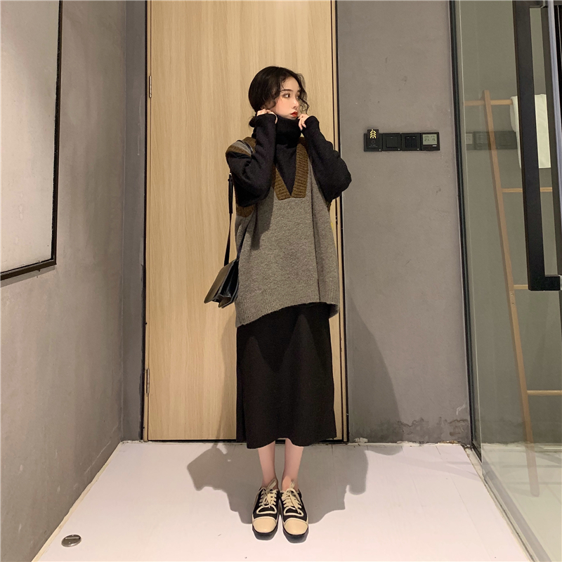 / 撞色V領毛衣馬甲小背心+高領加厚黑色毛衣女2018新款+毛呢半身裙