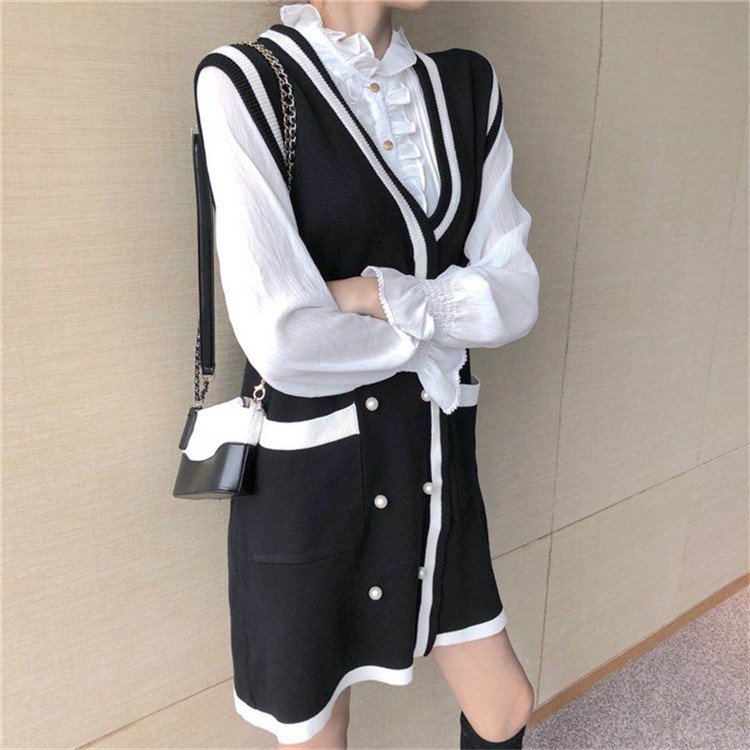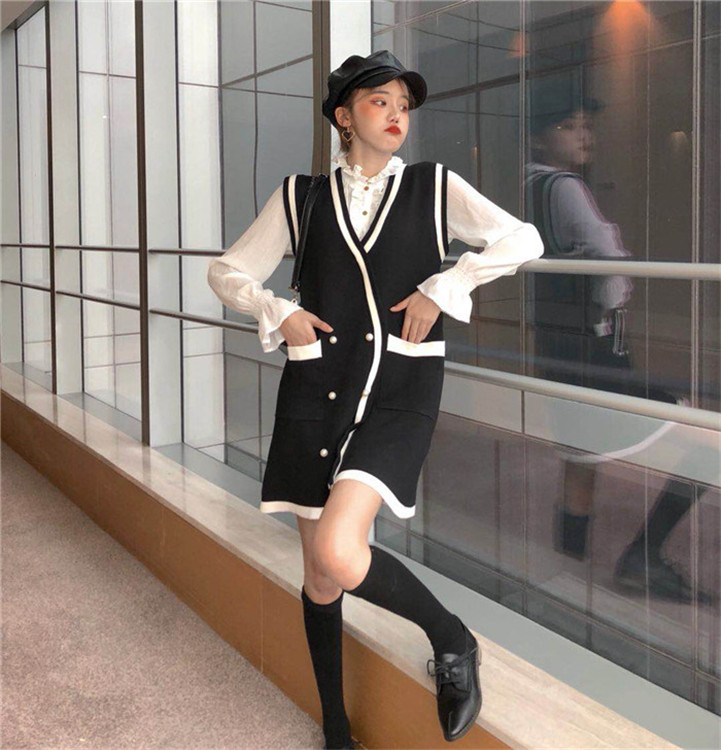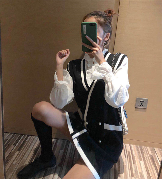 / 韓版名媛小香風時尚套裝秋季新款毛線裙襯衣套裝毛衣背心裙兩件套