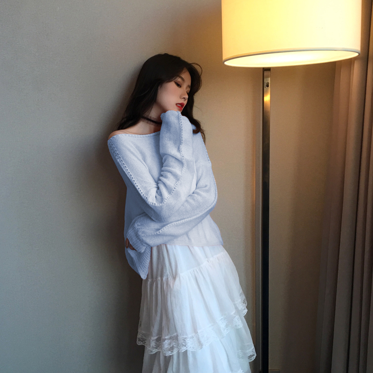 chic早秋上衣慵懶舒適兩色柔軟馬海毛網紅毛衣+仙女蕾絲蛋糕裙子