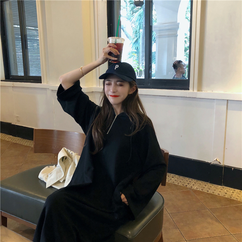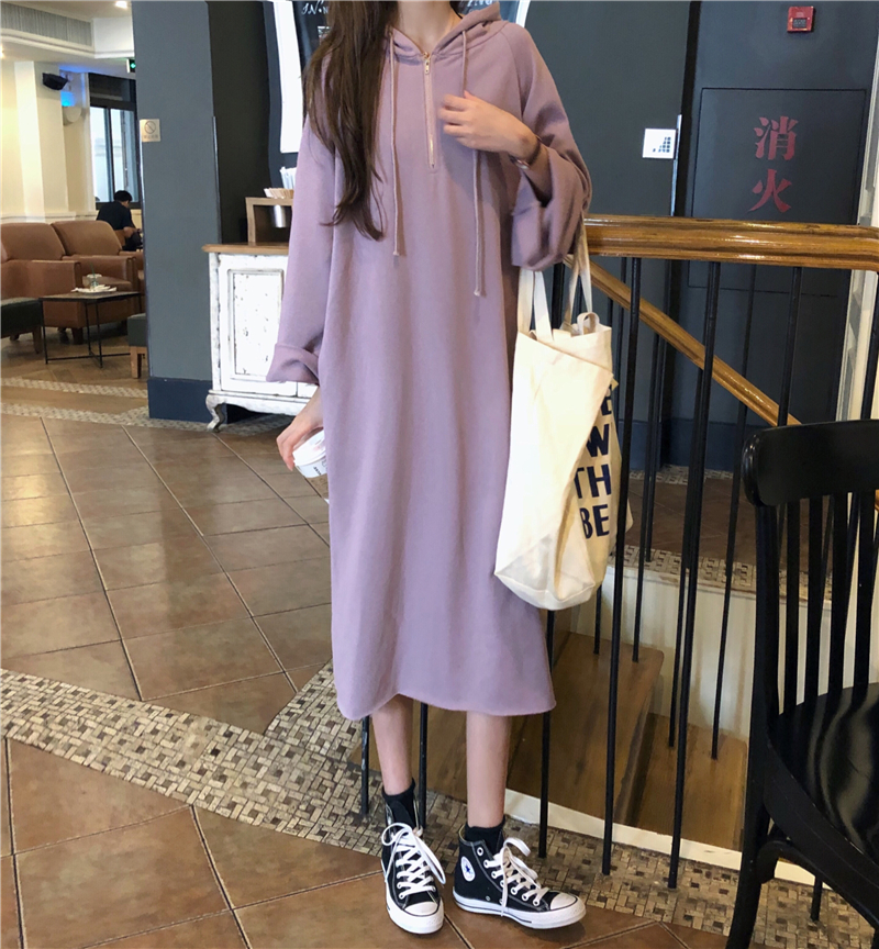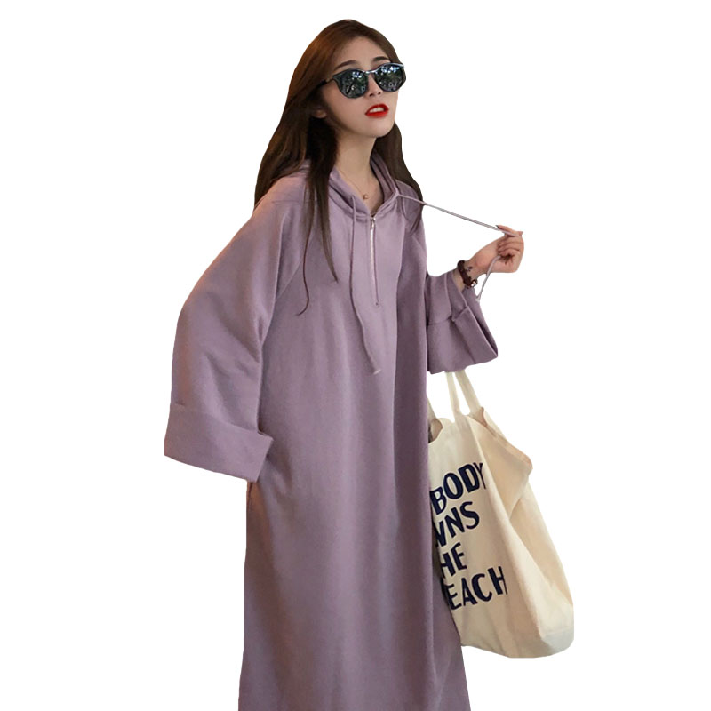 秋季女裝2018新款韓版復古寬松慵懶風口袋連帽長款超火衛衣裙外套