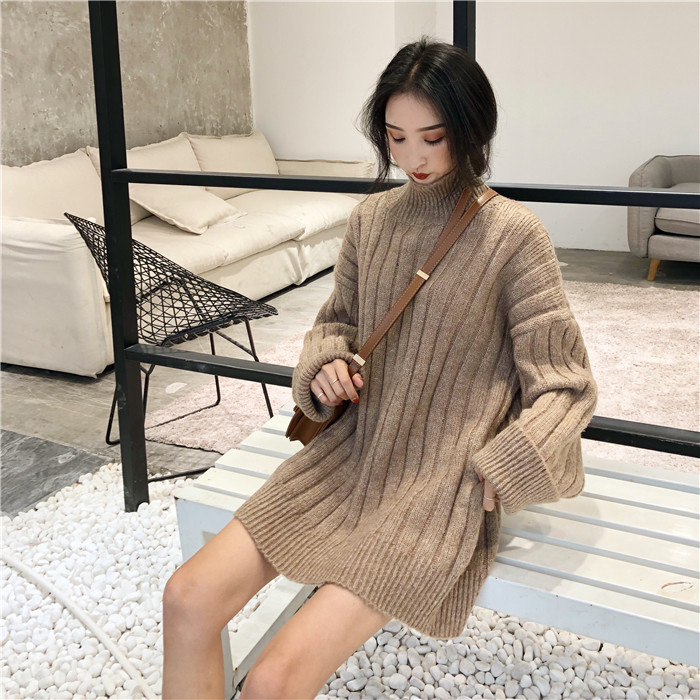 韓系早秋時尚網紅毛衣女2018新款寬松慵懶風加厚高領顯瘦遮臀毛衣
