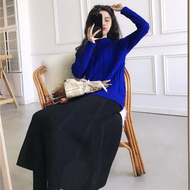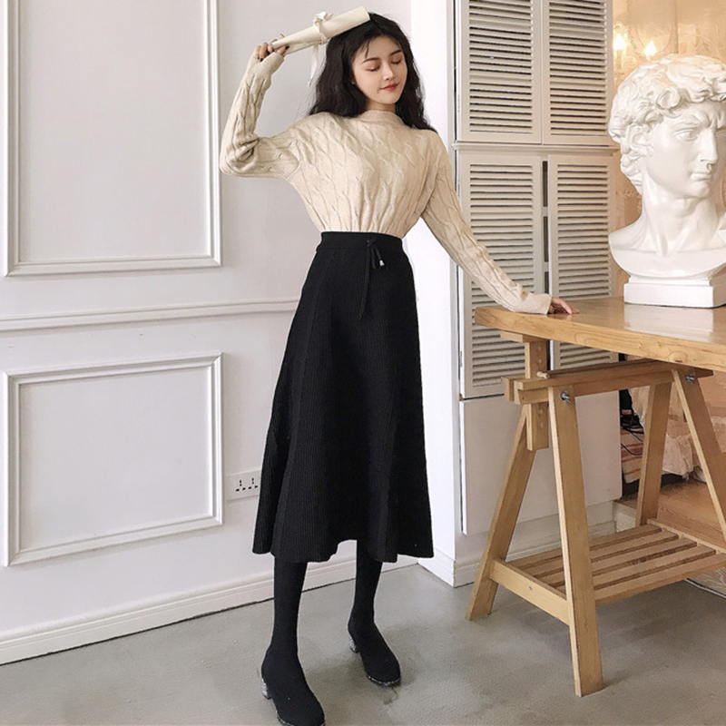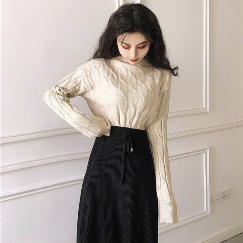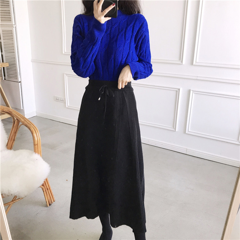 御姐套裝女秋冬新款麻花寬松毛衣外套黑色高腰顯瘦針織A字半身裙
