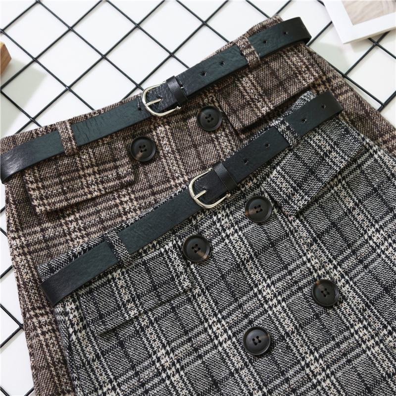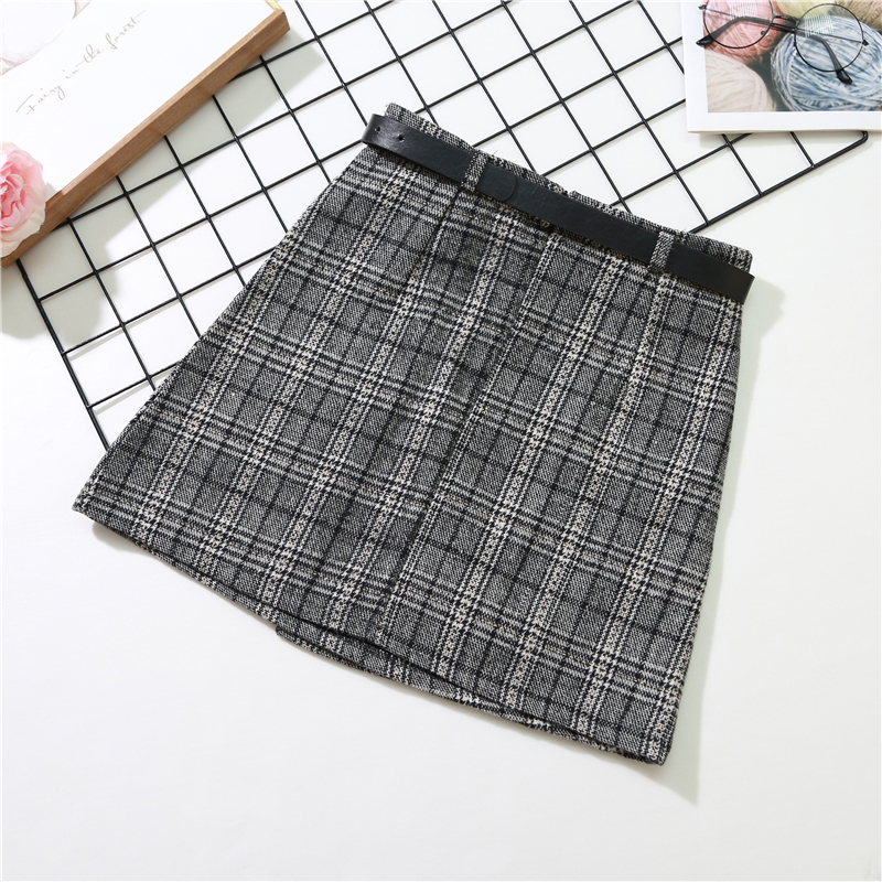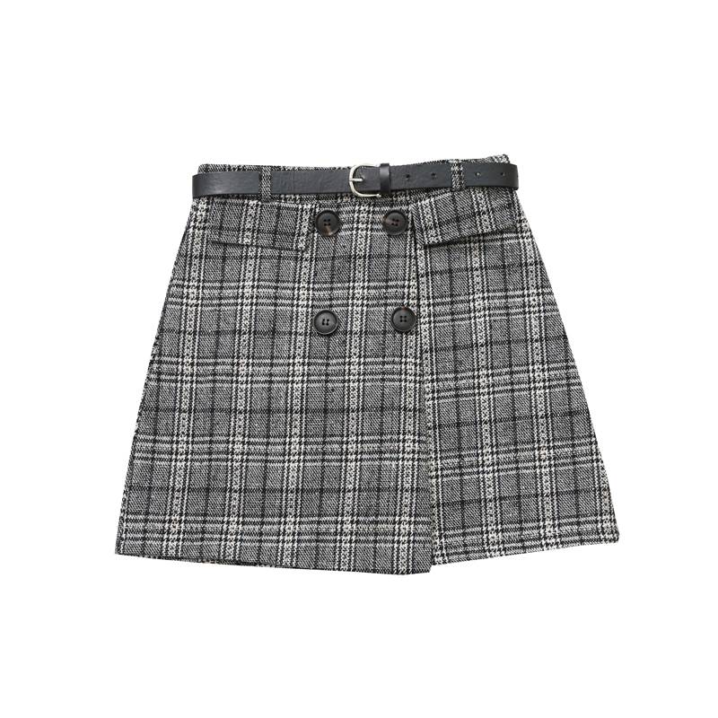 / 復古格子腰帶高腰顯瘦短裙秋裝女2018新款紐扣裝飾學生A字半身裙