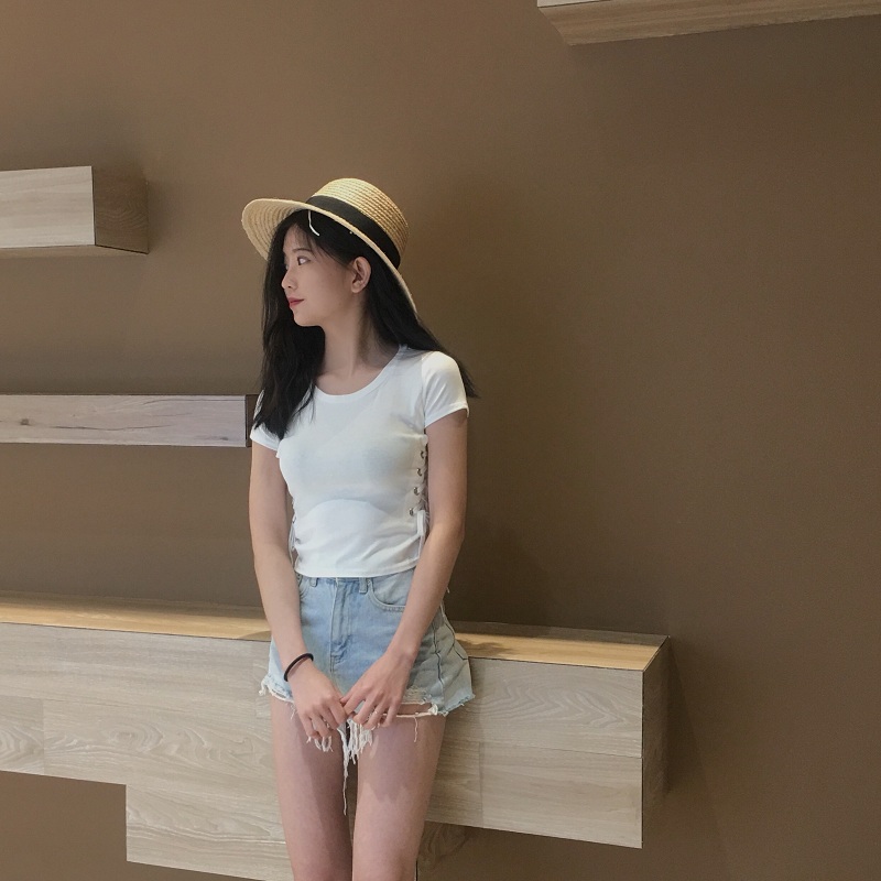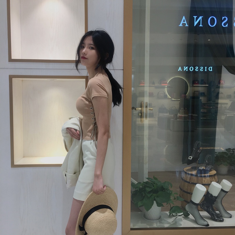 / 夏季新款女裝韓版綁帶修身短款上衣女氣質顯瘦純色緊身短袖T恤衫