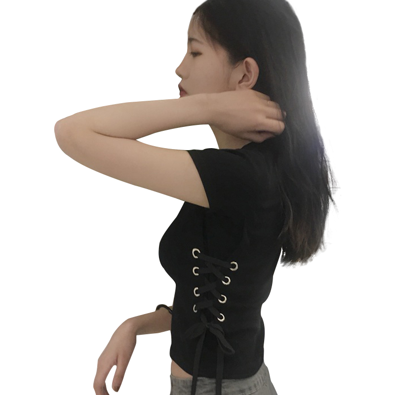 夏季新款女裝韓版綁帶修身短款上衣女氣質顯瘦純色緊身短袖T恤衫