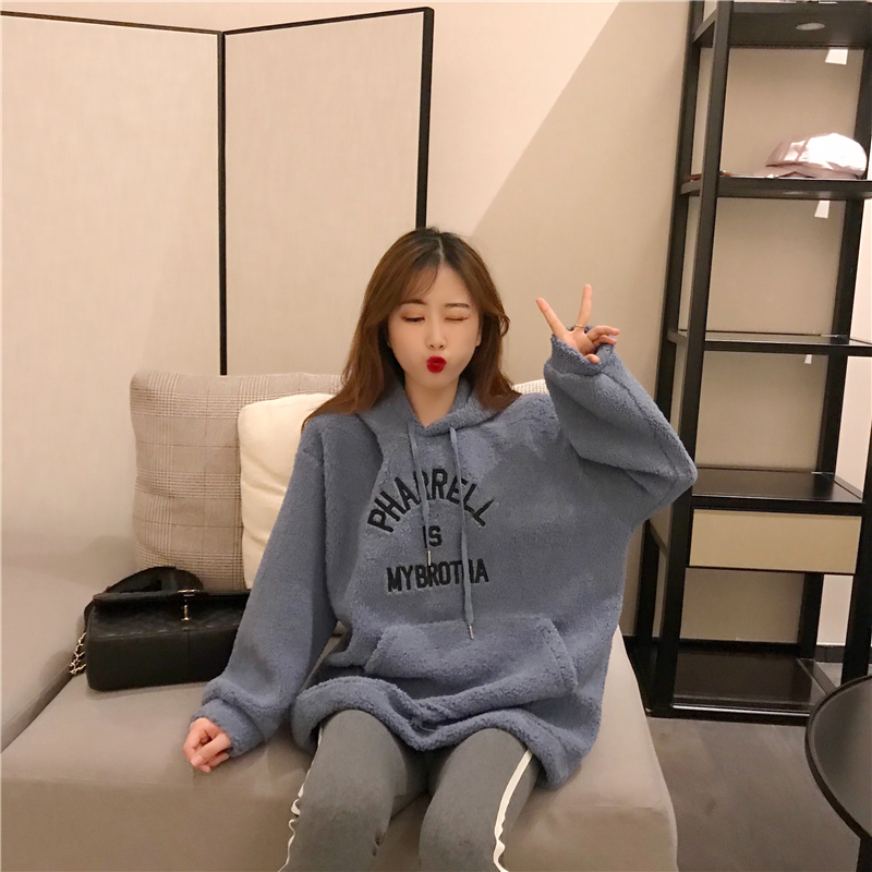 / 羊羔毛字母衛衣女秋冬2018新款氣質抽繩長袖韓版刺繡連帽套頭上衣