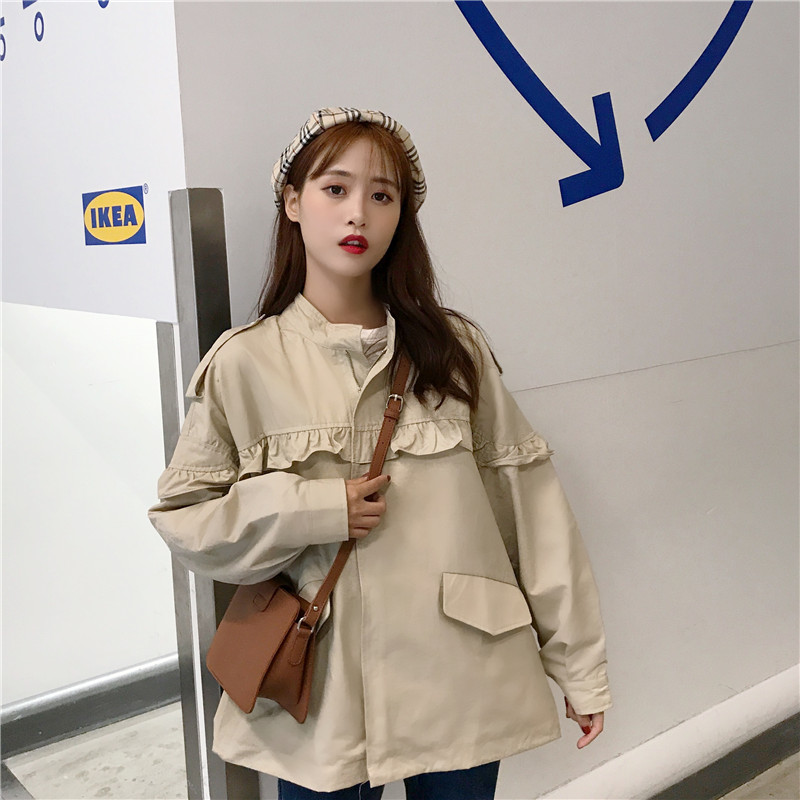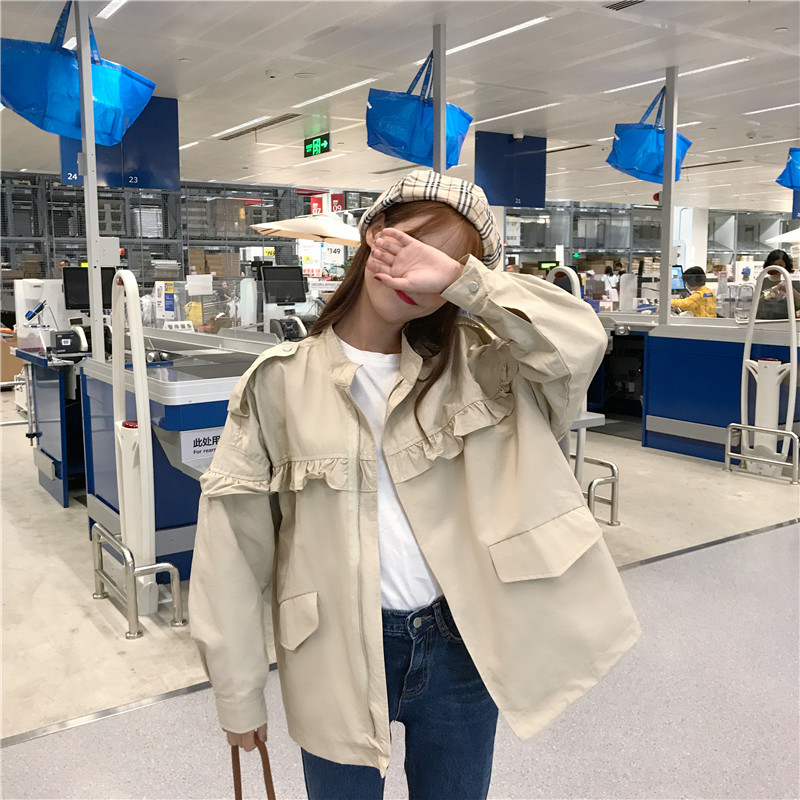 / 秋季女裝2018新款韓版復古工裝中長款木耳邊休閑寬松夾克上衣外套