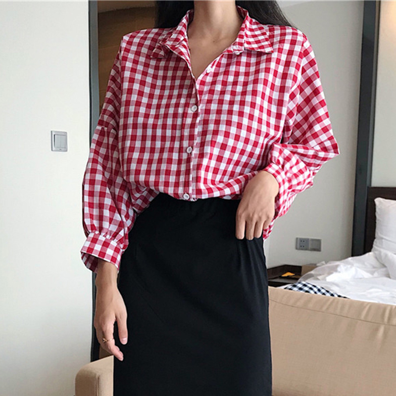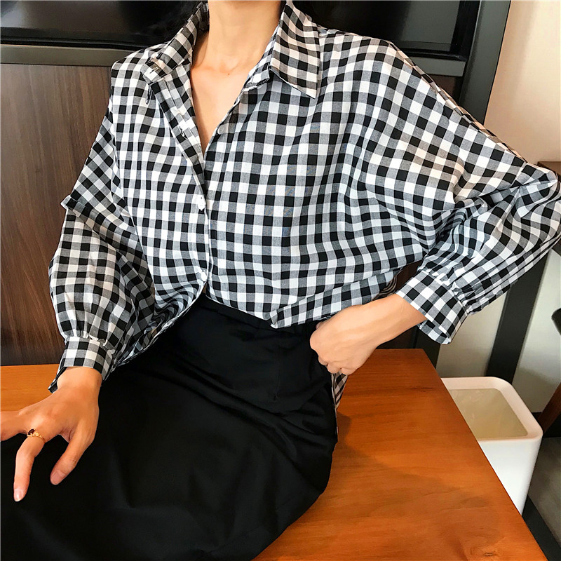 / 秋冬女裝2018新款韓版時尚翻領格子襯衣中長款寬松蝙蝠長袖襯衫潮