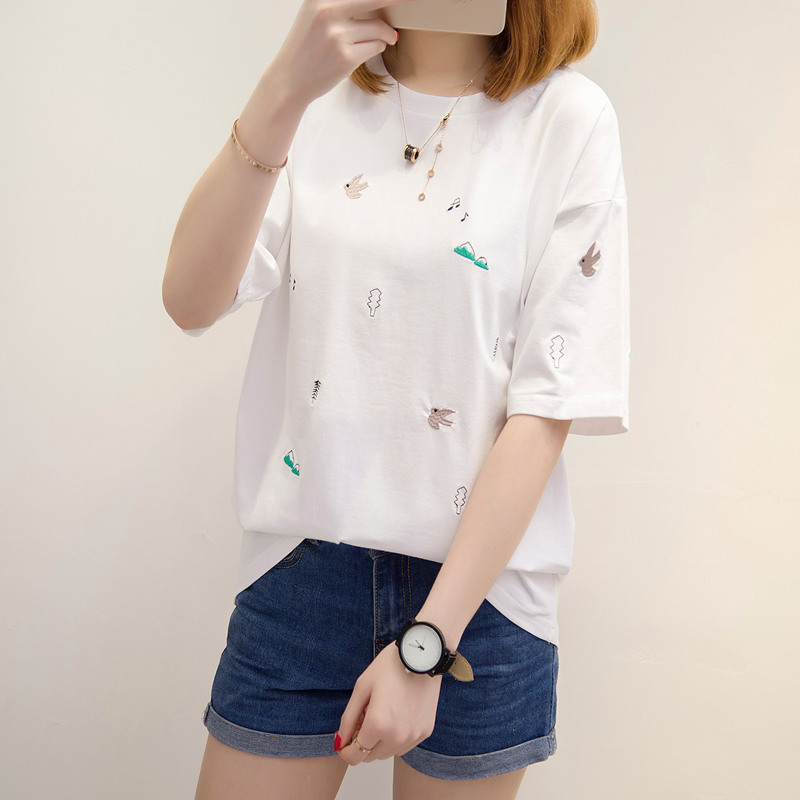 / 短袖t恤女寬松上衣女夏韓版白色體恤衫刺繡衣服夏裝新款女裝