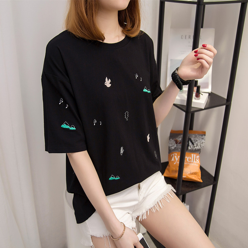 短袖t恤女寬松上衣女夏韓版白色體恤衫刺繡衣服夏裝新款女裝