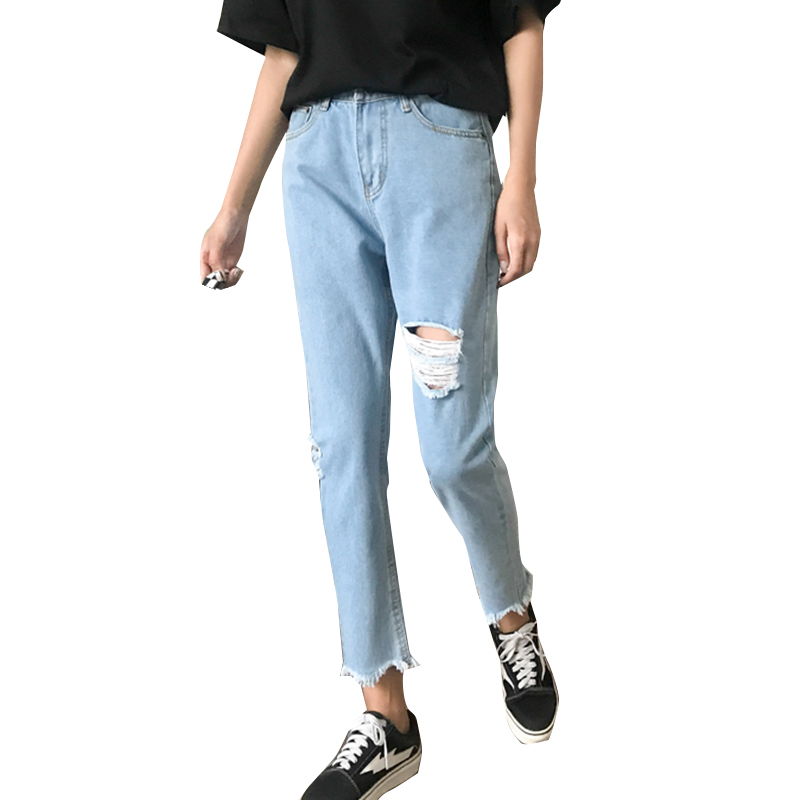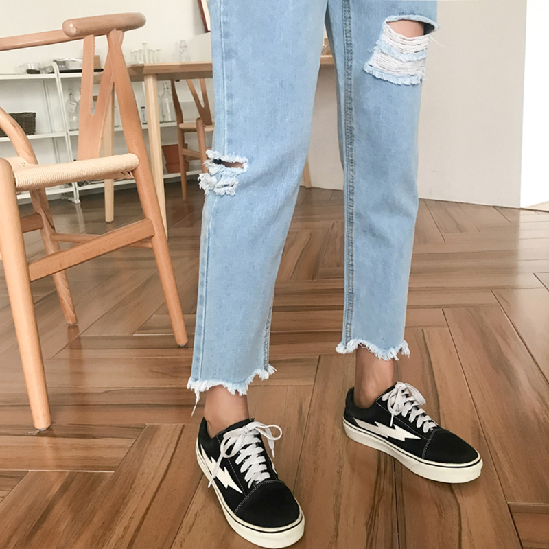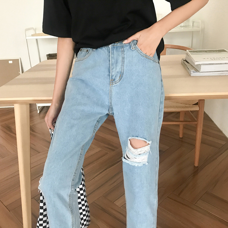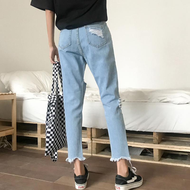 / 牛仔褲女夏新款韓版女裝高腰破洞毛邊乞丐褲小寬松直筒褲九分褲子