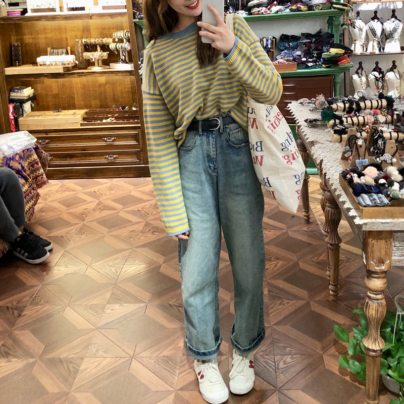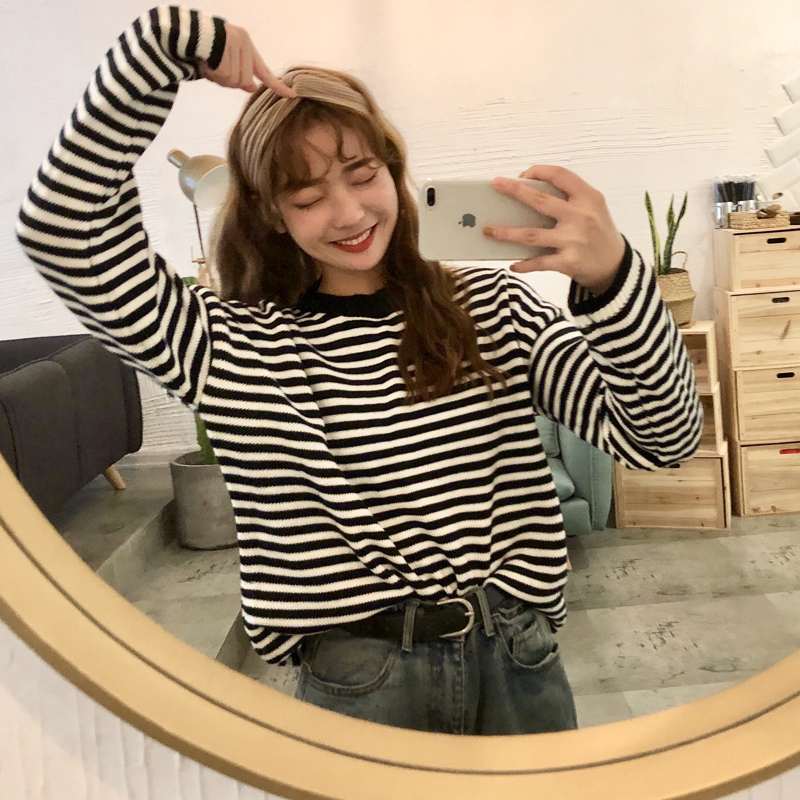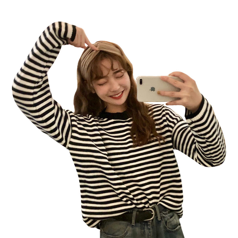 / 秋冬女裝韓版慵懶風寬松撞色條紋長袖套頭網紅毛衣針織衫上衣外套
