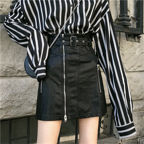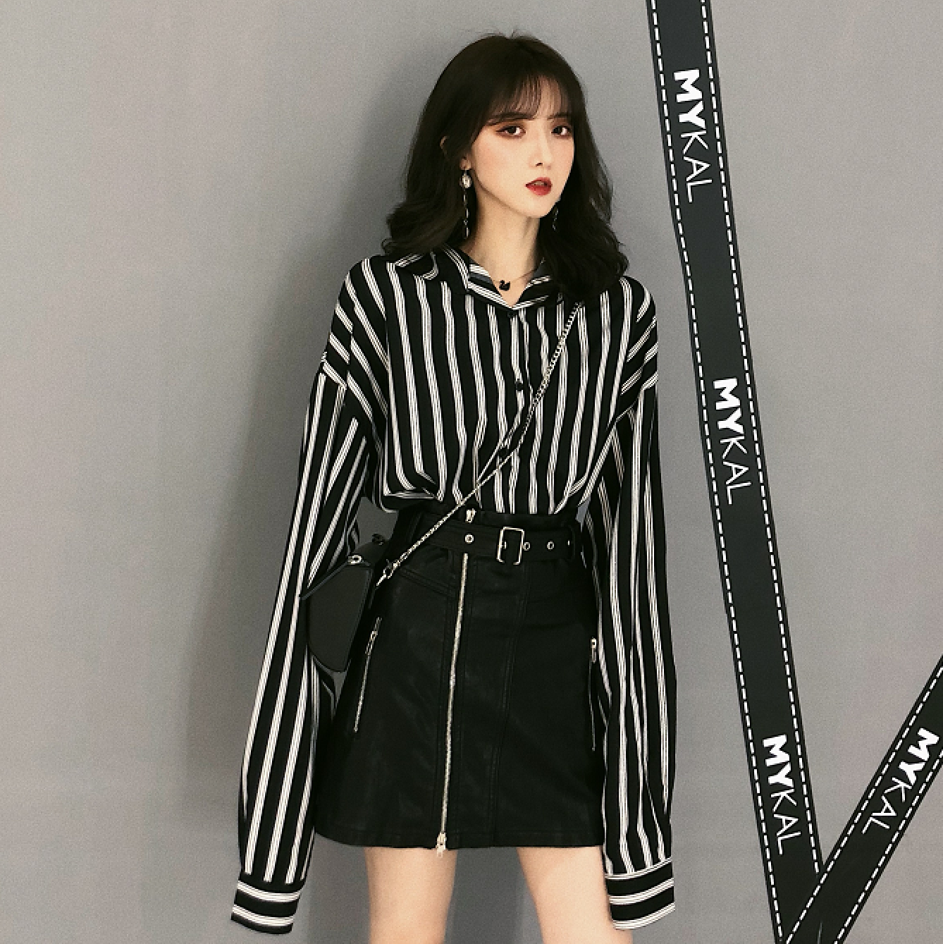 / 秋裝女2018新款套裝百搭打底條紋長袖襯衫+PU皮高腰半身裙兩件套