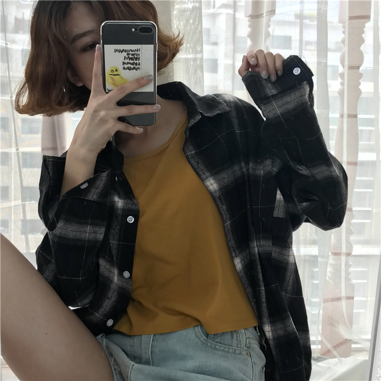 / 秋季女裝韓版寬松百搭顯瘦大格子長袖襯衫中長款休閑襯衣上衣外套
